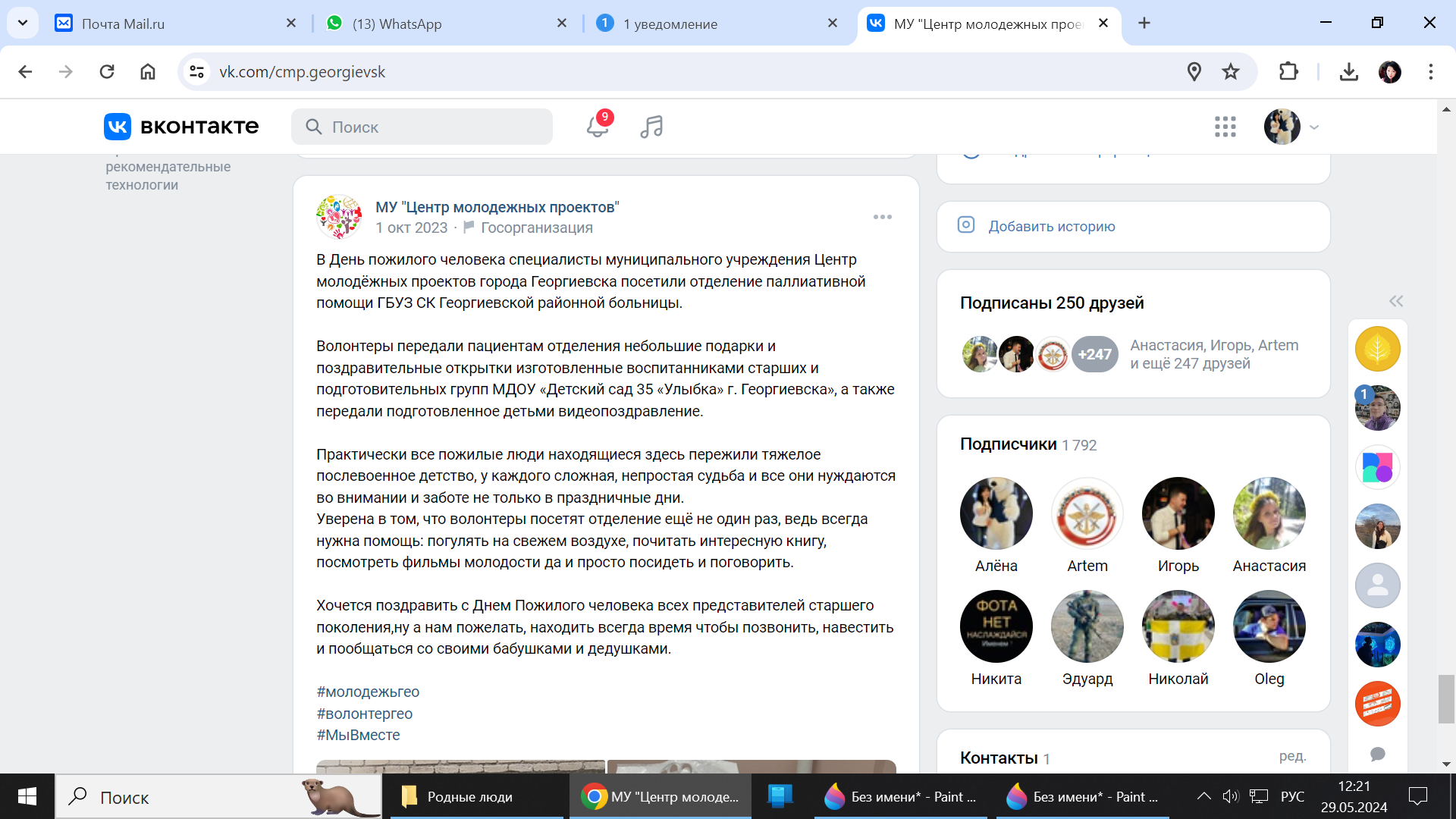 С февраля 2023 года волонтеры Муниципального учреждения "Центр молодёжных проектов" города Георгиевска взяли на себя ответственность помогать пожилым людям находящимся в отделении.