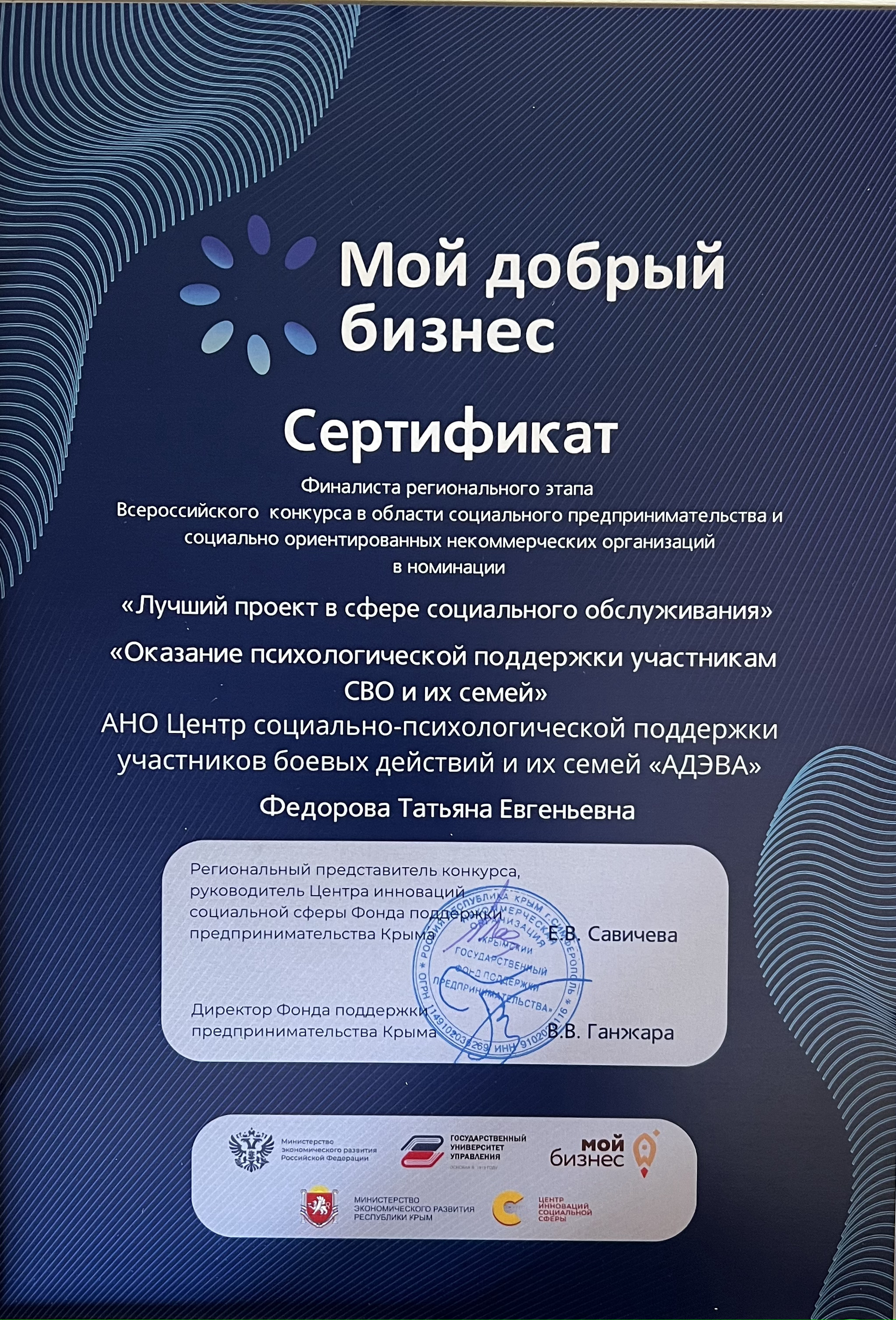Центр социально-психологической поддержки участников боевых действий «АДЭВА» стал победителем регионального этапа Всероссийского конкурса «Мой добрый бизнес» в номинации «Лучший проект в сфере социального обслуживания».