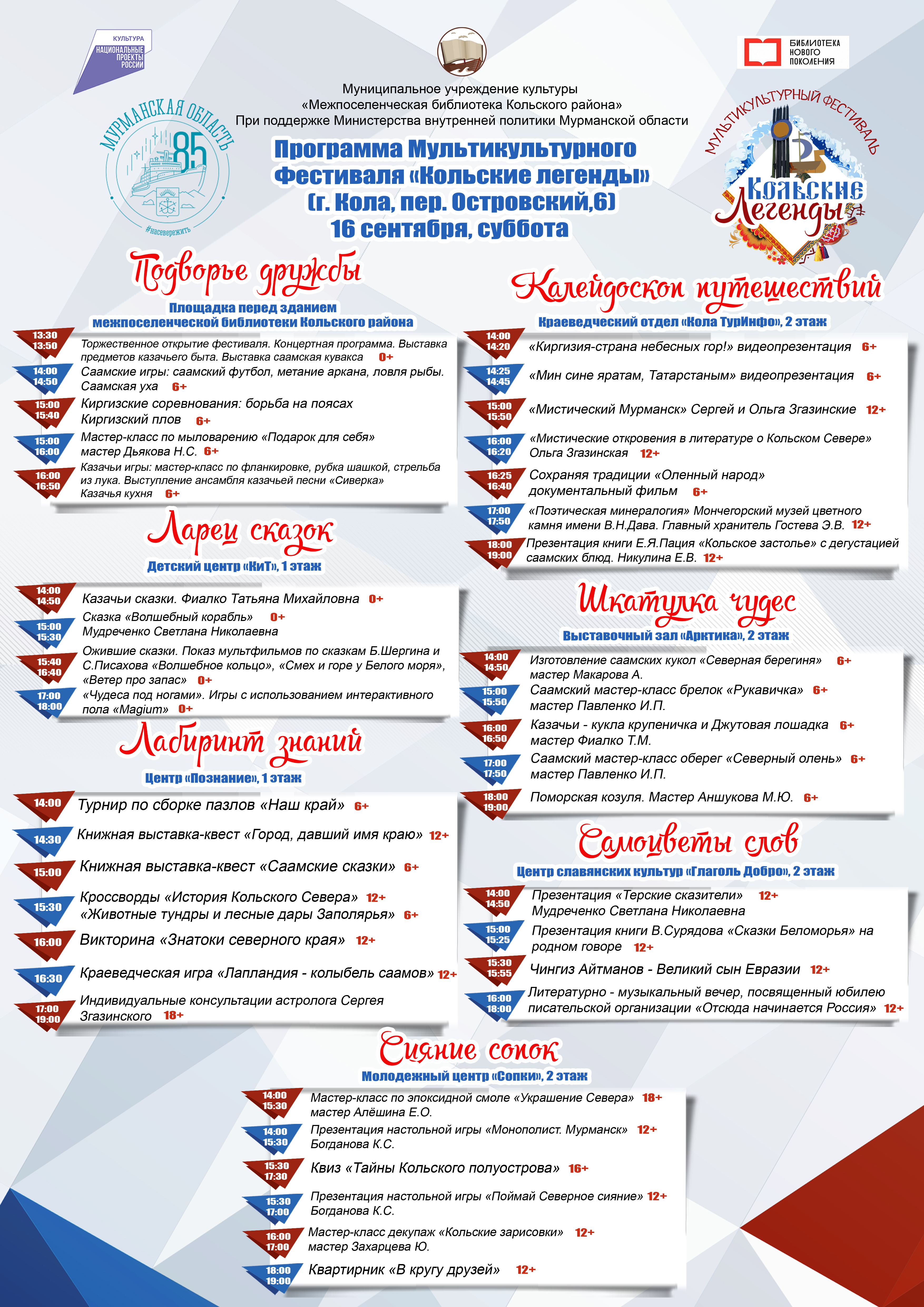 Фестиваль посетило около 1000 человек на семи площадках «Подворье дружбы», «Сияние сопок», «Самоцветы слов», «Лабиринт знаний», «Калейдоскоп путешествий», «Ларец сказок», «Шкатулка чудес». Было проведено 7 мастер-классов, 3 выставки, 6 игр и квизов, национальные игры, 7 презентаций, коонсультация астролога, показ терх мультфильмов, и документального фильма "Оленный народ", литературно-музыкальный вечер "Отсюда начинается Россия", квартирник " В кругу друзей". Общее количество проведенных мероприятий - 38.