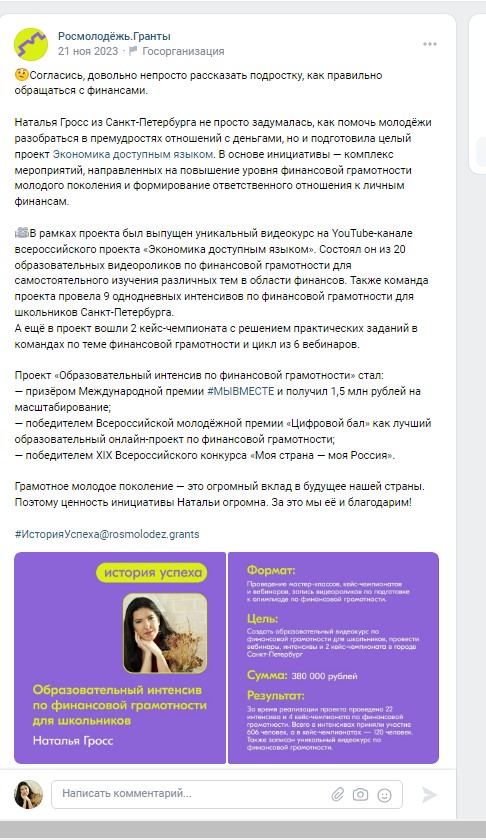 - Разработали уникальный образовательный видео курс по финансовой грамотности для школьников старших классов, 20 видеороликов, общий охват более 60 000 просмотров.