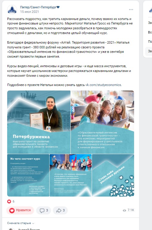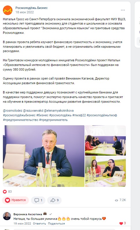 Проект был поддержан грантом от Росмолодежи на сумму 380 000 рублей, в рамках которого мы провели 9 интенсивов по финансовой грамотности, остальные проводили на волонтерских началах.