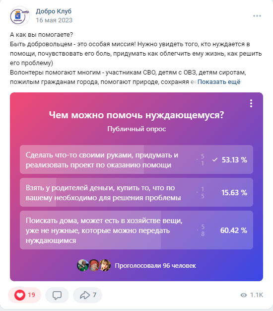 Количество молодых людей, занимающихся добровольческой деятельностью, также неуклонно растет. В настоящий момент на платформе «Добро.РФ» зарегистрированы 3000 волонтеров. Авторы более 50 социальных проектов ежегодно принимают участие в муниципальном, региональном этапах конкурса на лучшую социальную практику. На участие в Международной Премии #МЫВМЕСТЕ в 2022 году было подано более 30 заявок, 7 авторов проектов стали полуфиналистами, 1 проект вышел в финал Премии.
