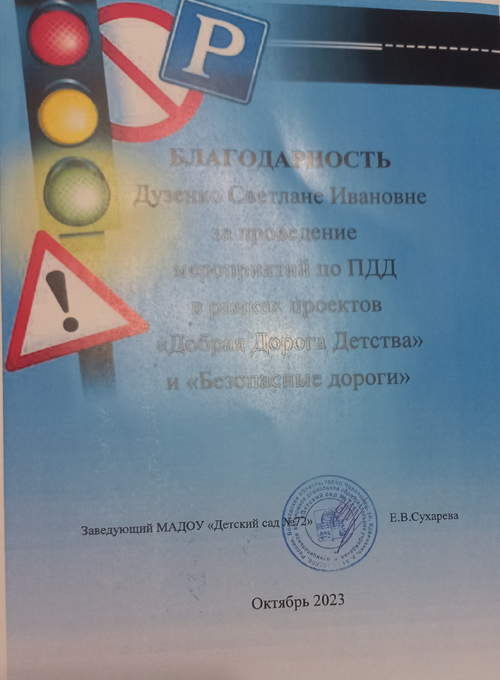 - формирование навыков сознательного дисциплинированного поведения на улице, дороге, в общественном транспорте через организацию массовых мероприятий: "День светофора" традиционно в августе , "День знаний" к 1 сентября , "День памяти жертв ДТП" в 3 воскресенье ноября и семинаров для педагогов и воспитателей по теме развития дорожных родительских патрулей;