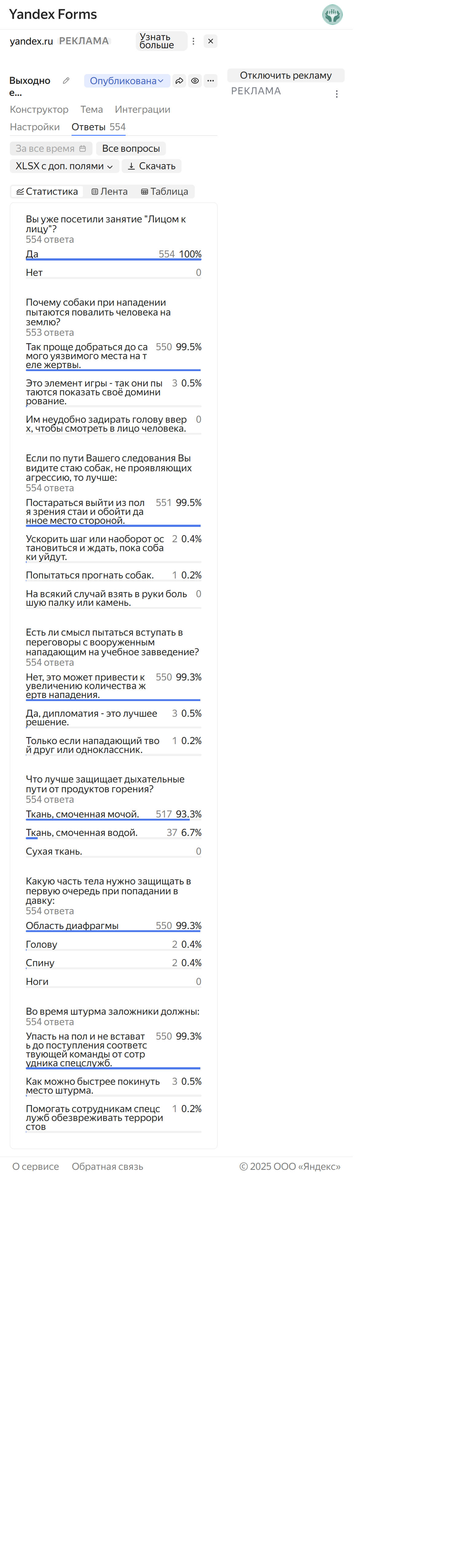 Согласно анализу проведенных тестирований (входное и выходное) у учащихся, посетивших интерактивные профилактические занятия "Лицом к лицу" значительно повысился уровень компетенций в области безопасности жизнедеятельности при нахождении в опасных и чрезвычайных ситуациях.