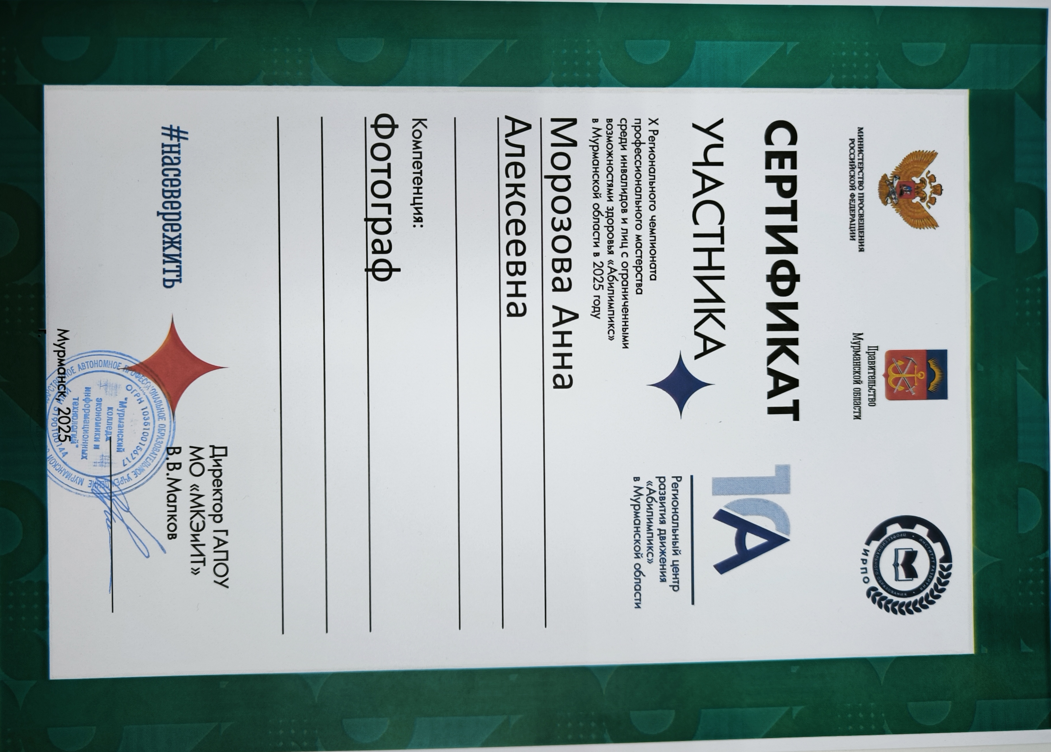 В 2025 году проект «Инклюзивная творческая лаборатория «Северный формат» стал победителем регионального конкурса отбора лучших коррекционных и здоровьесберегающих практик по работе с несовершеннолетними, имеющими ограниченные возможности здоровья в номинации «Искусство развития. Путь к успеху через творчество». Также в этом году участница нашего проекта Анна Морозова приняла участие в X региональный чемпионат профессионального мастерства среди инвалидов и лиц с ограниченными возможностями здоровья «Абилимпикс» в Мурманской области в 2025 году в категории «Специалисты», номинация «Фотограф».