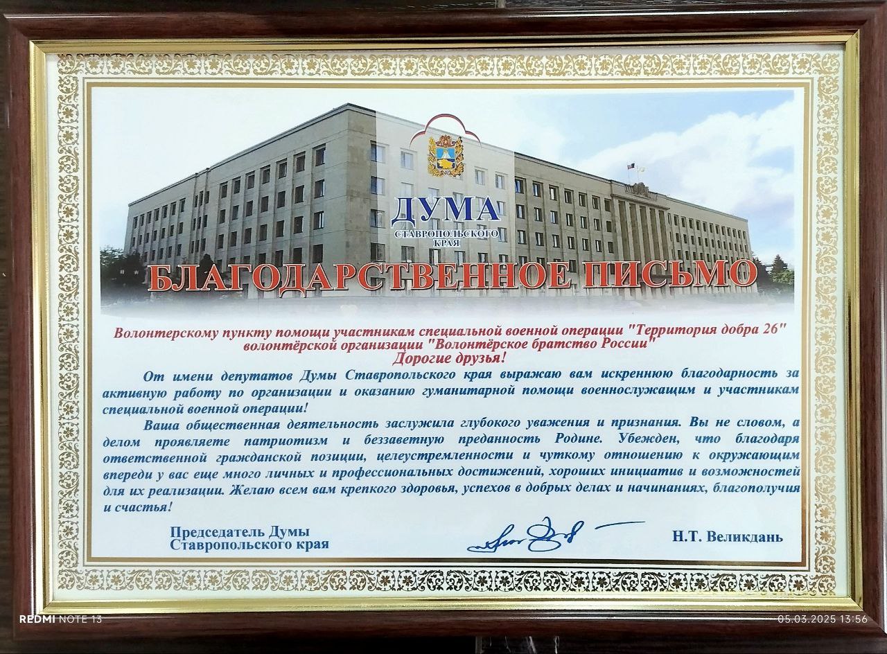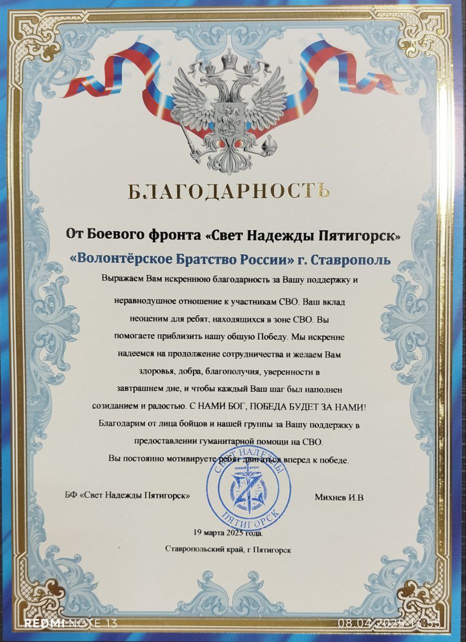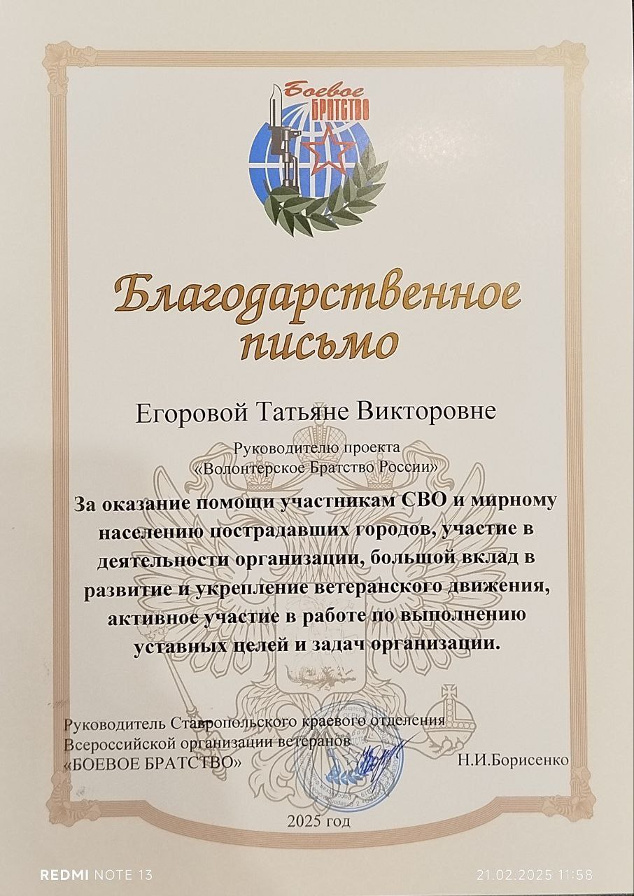 Я как Индивидуальный Предприниматель и руководитель Пункта помощи для участников СВО "Территория добра 26" ID 10125106 отшивая бесплатно в своем волонтёрском ателье одежду и тактическую амуницию и отправляя на передовую организовала Волонтёрскую организацию "Волонтёрское Братство России" для того, чтобы объединить Волонтерские группы России для помощи участникам СВО и мирному населению пострадавших городов. Объединив админов и руководителей волонтёрских групп, НКО и тд, мы делаем одно Благое дело для наших ребят. Мы все как-то соприкасаемся одна группа с другой, другая с третьей, и мы все друг с другом связаны. Принимаем заявки от волонтёрских групп и непосредственно от ребят, поэтому нужно и правильно нам всем объединиться и взаимодействовать друг с другом. За год работы Волонтёрской организации "Волонтёрское Братство России" мы быстро и оперативно отработали много заявок от наших родных участников СВО по разным направлениям по всей линии фронта. Не смотря на то что Волонтёрская организация "Волонтёрское Братство России" находится в Ставропольском крае сотрудничаем с Амурской областью, Волгоградской областью, Московской областью, Санкт-Петербург, ЛНР, ДНР, Ростовская область, Астраханская область, Ханты-Мансийский автономный округ, КЧР, КБР, Дагестан, Чечня и тд.