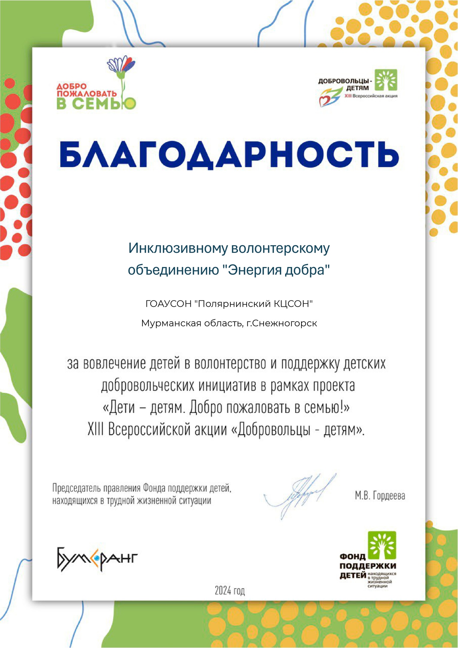 3 воспитанник в СОП, старше 14 лет, зарегистрирован на портале ДОБРО.ру. 2 воспитанника с инвалидностью зарегирированны на портале ДОБРО.ру 4 воспитанника являются волонтёрами Победы Мурманской области, 2 - вошли в состав Международного волонтёрского корпуса 80-летия Победы.