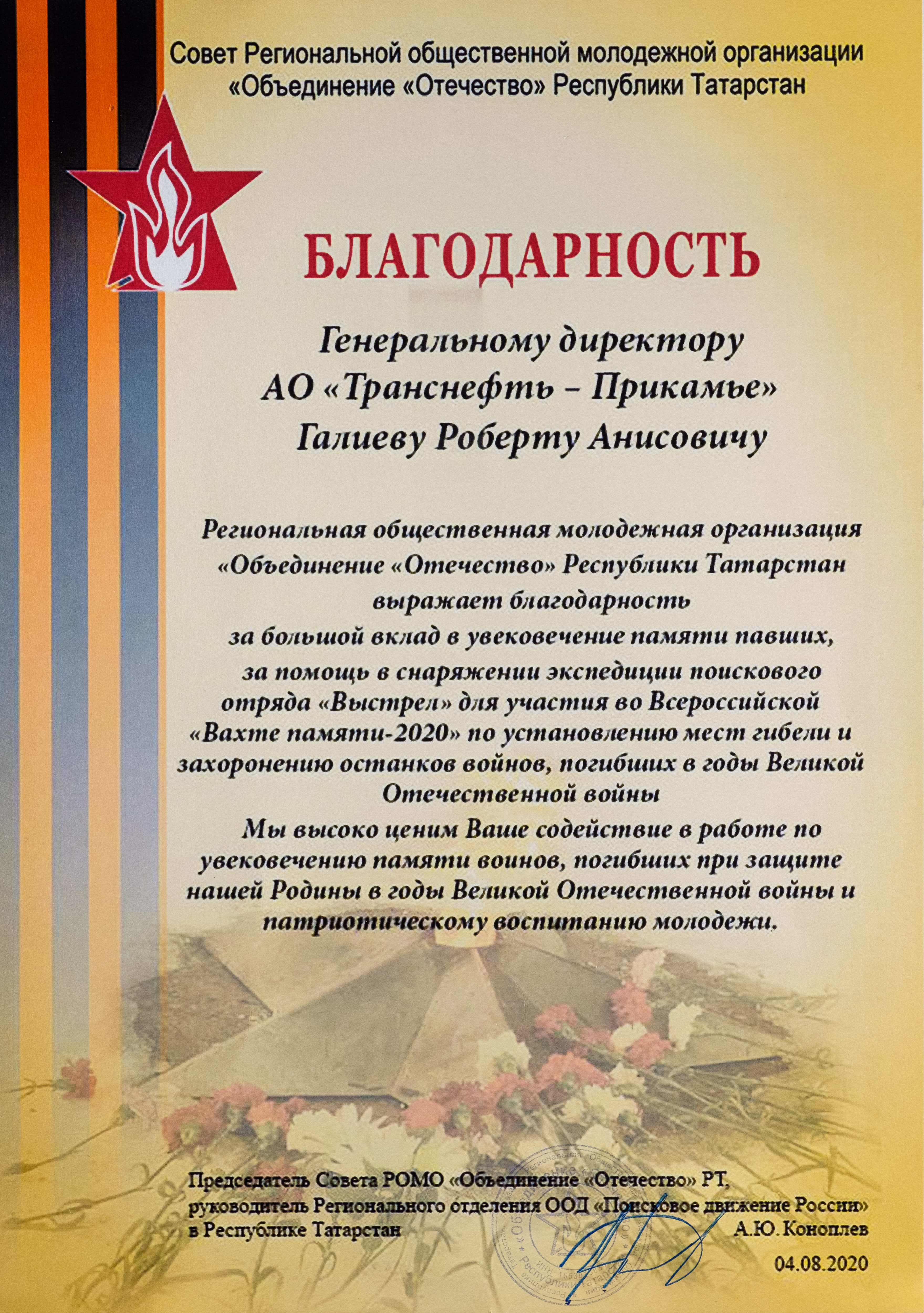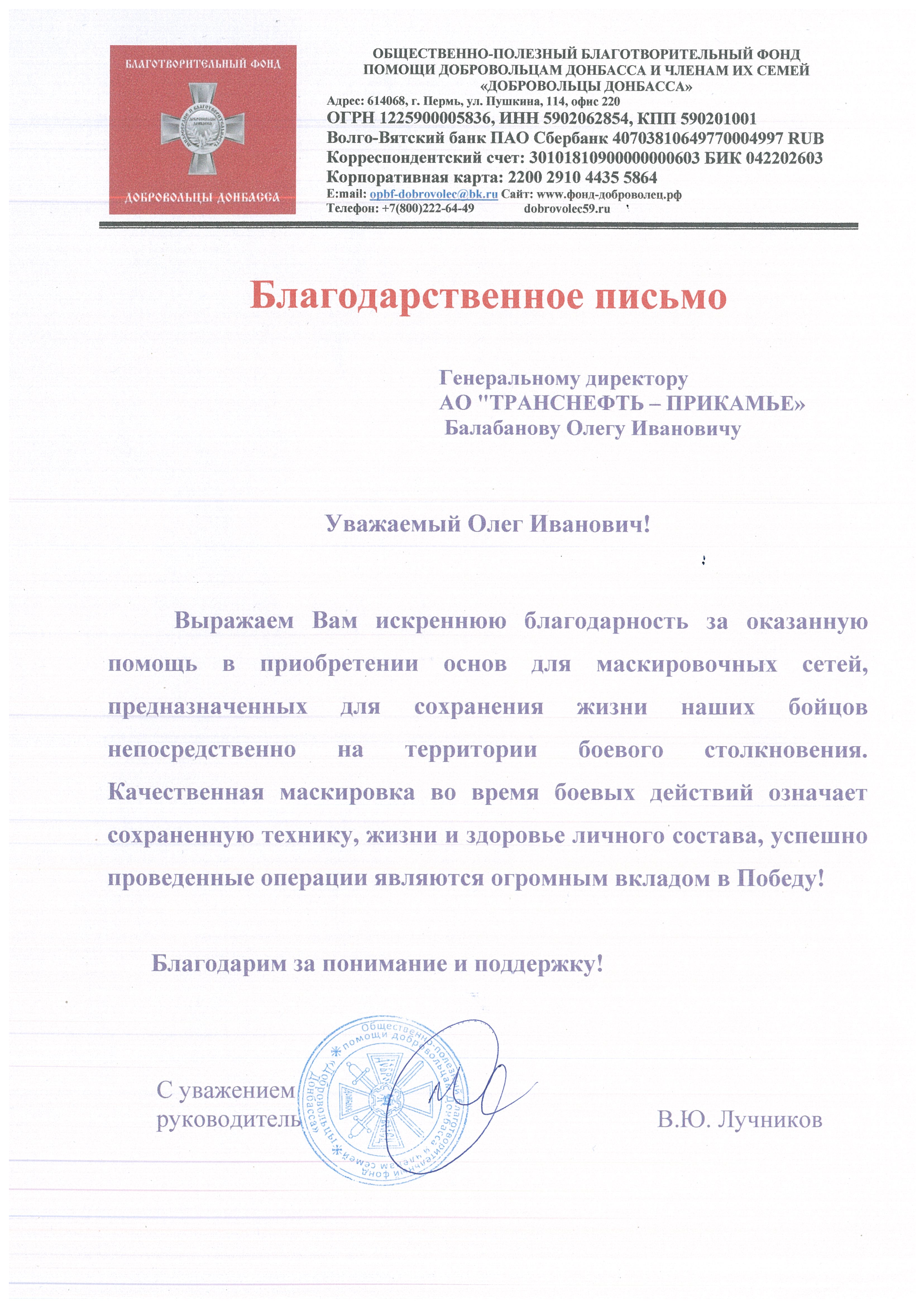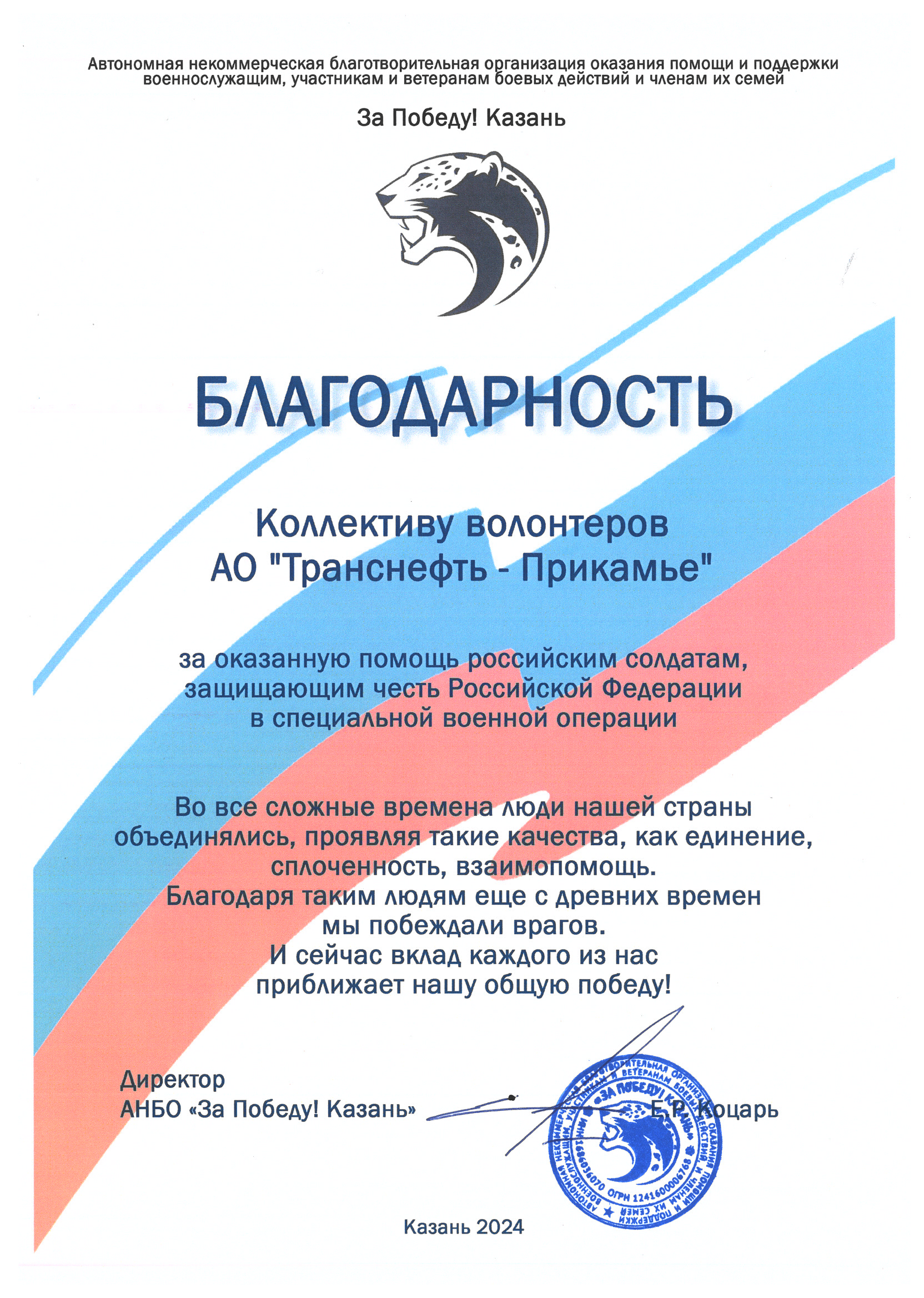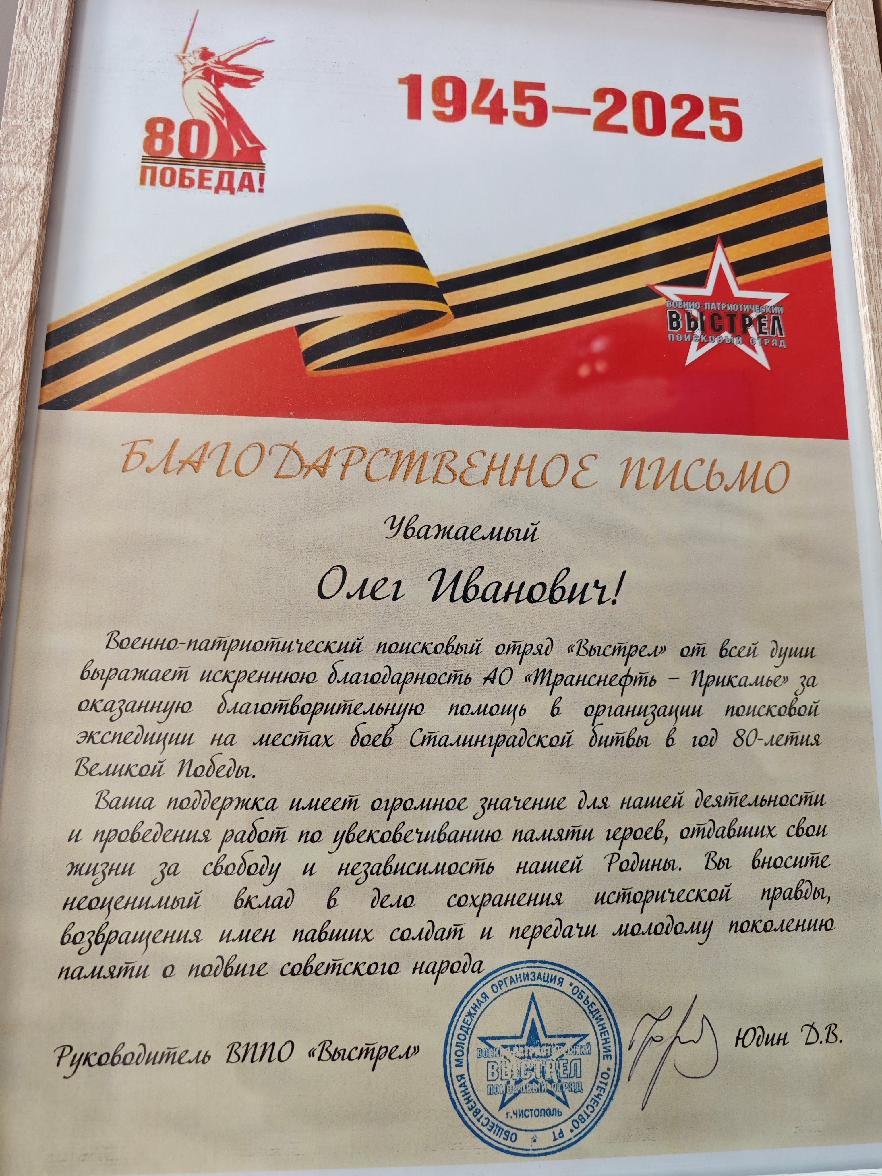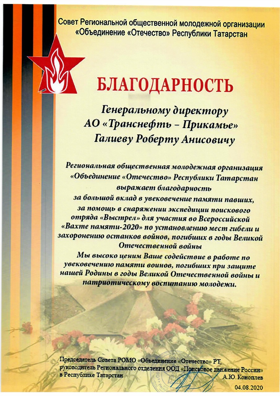 За 2024-2025 гг: 1.Благотворительная помощь - около 7 млн руб 2.Волонтерская помощь: - В офисе оборудован пункт плетения маскировочных сетей в партнерстве с АНБО "За Победу! Казань." Передано более 40 сетей - Собрано более 1,7 млн руб для помощи бойцам СВО и их семьям, более 105 тыс руб новым территориям РФ 7. Проведено более 350 патриотических акций 8. Участие в 4 поисковых экспедициях, 1 военно-исторической реконструкции.Создан обучающий ролик о поисковой деятельности 7. Благоустроено более 40 мемориальных мест 8. Поддержана акция «Живая память благодарных поколений»- создание памятника из сплава советских монет , посвященного подвигу советского народа. Инициатор – Фонд Талая (Беларусь),партнеры – Музей Победы и др. Собрано более 45 кг монет участниками из более 20 регионов РФ.К 9 мая памятник установлен в Москве 9.Акция "Сад Памяти" - высажено более 1 000 саженцев деревьев в Татарстане, Пермском крае, Удмуртии 10.Проведены более 10 уроков мужества и открытых уроков школьникам об истории трубопроводного транспорта в годы ВОВ с участием поисковых отрядов и участников СВО