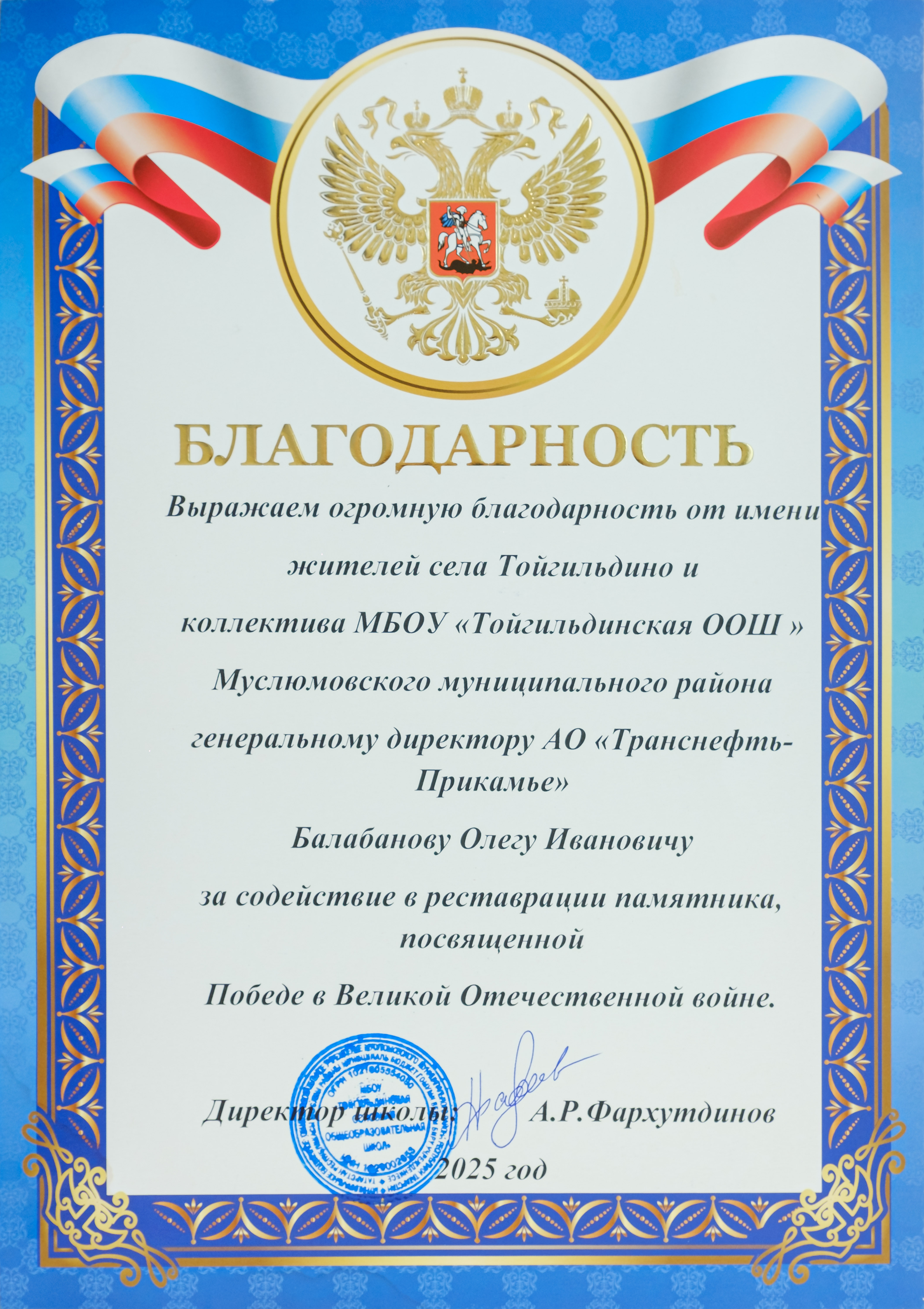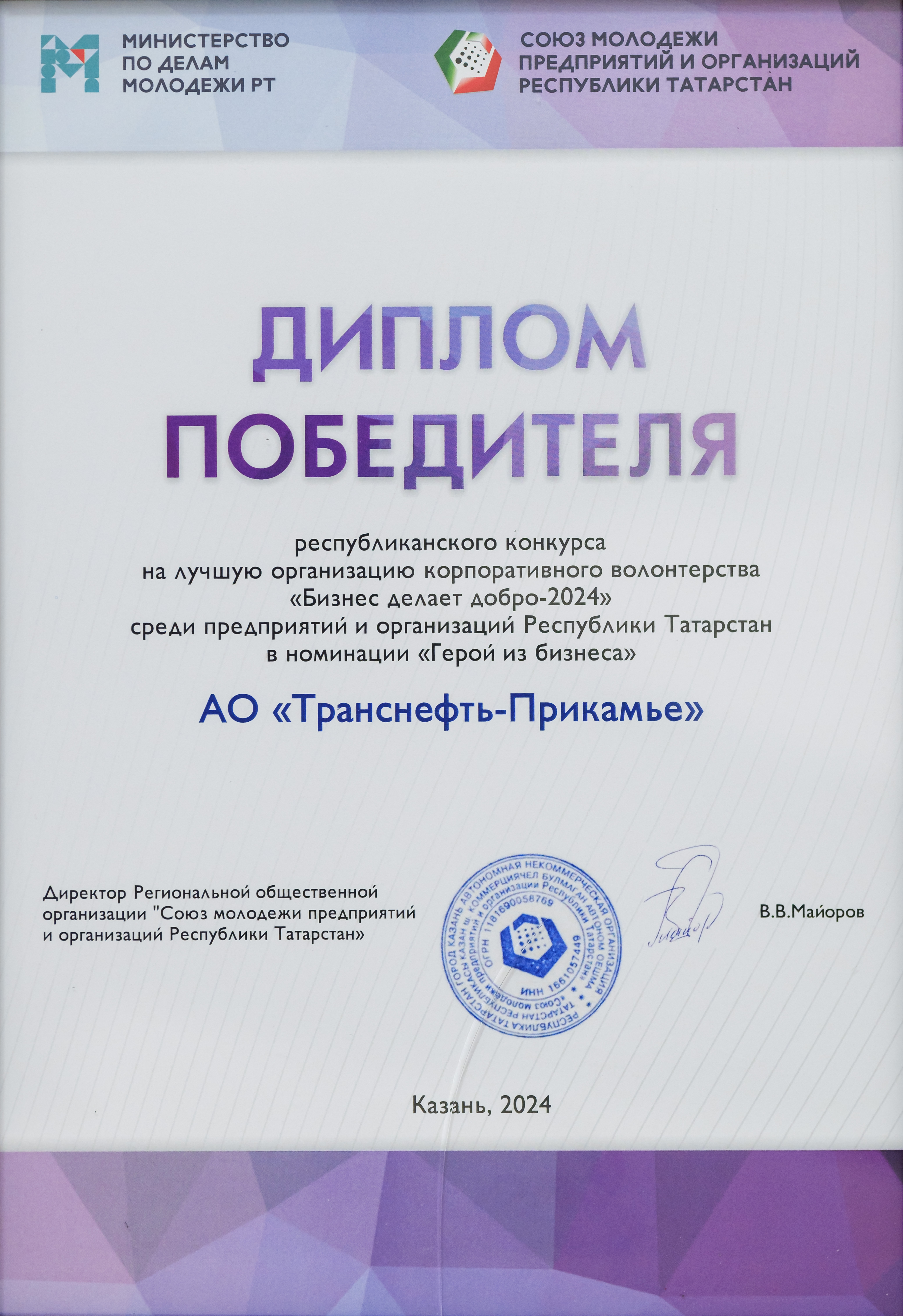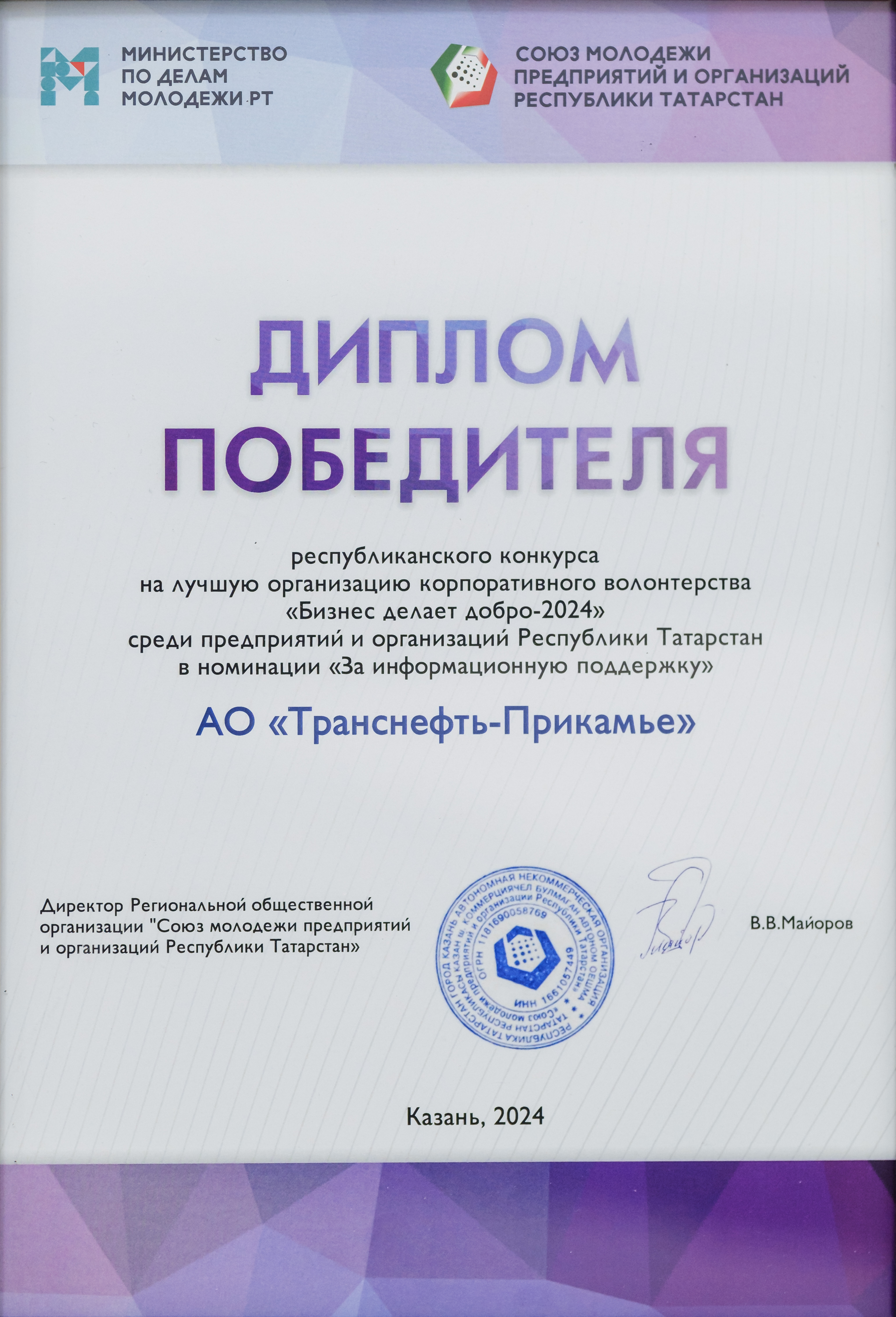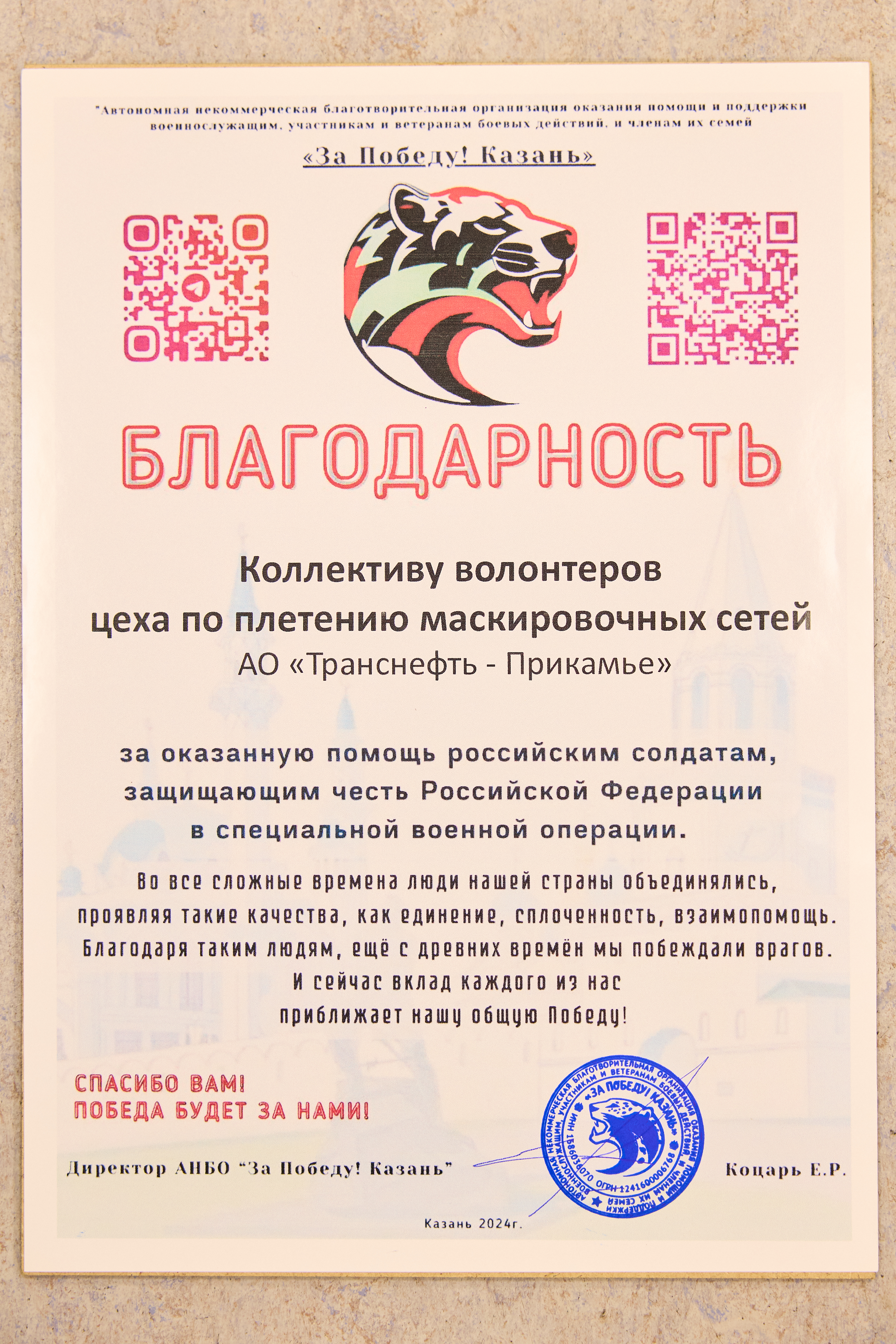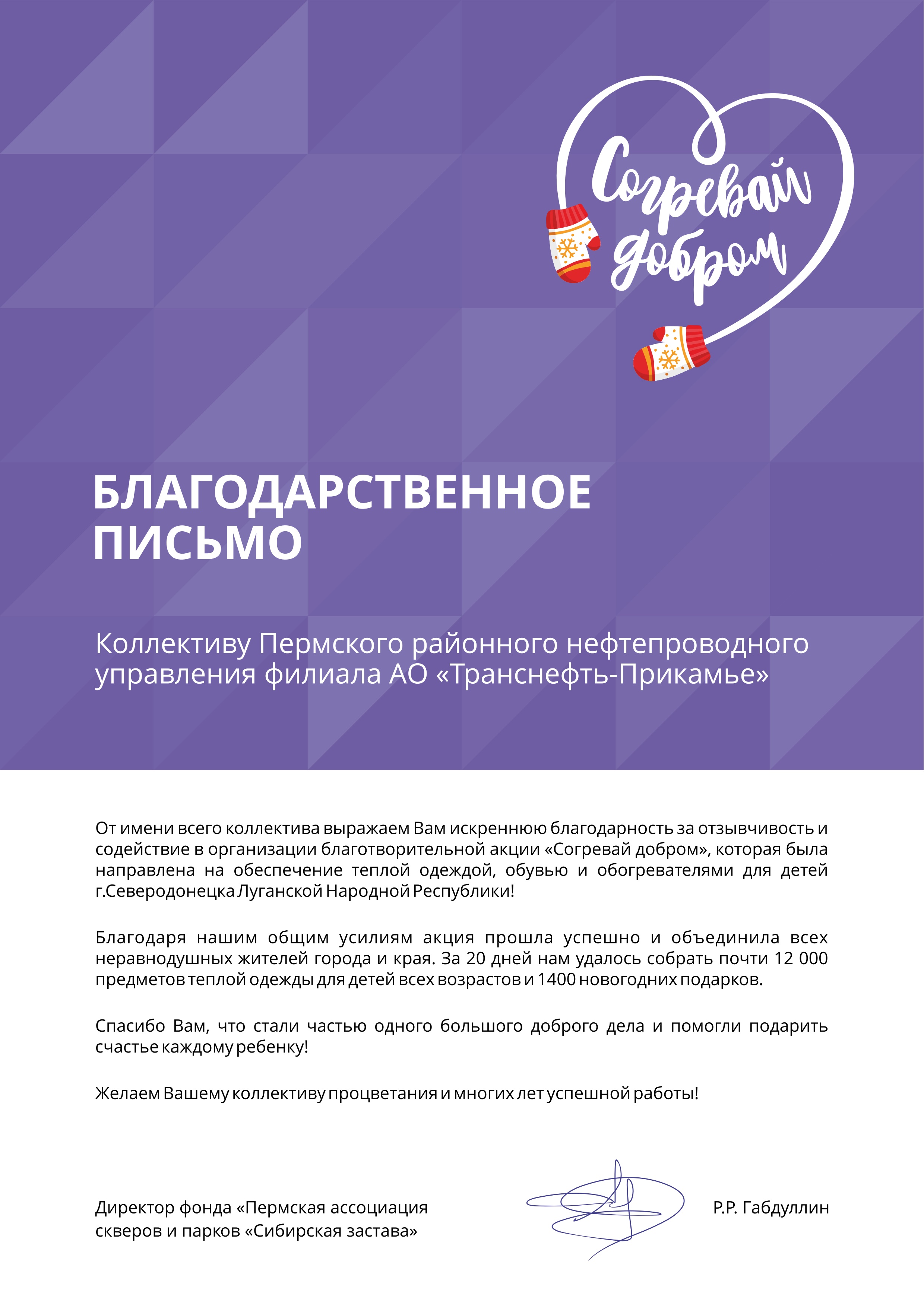 За 2024-2025 гг: 1.Благотворительная помощь - около 7 млн руб 2.Волонтерская помощь: - В офисе оборудован пункт плетения маскировочных сетей в партнерстве с АНБО "За Победу! Казань." Передано более 40 сетей - Собрано более 1,7 млн руб для помощи бойцам СВО и их семьям, более 105 тыс руб новым территориям РФ 7. Проведено более 350 патриотических акций 8. Участие в 4 поисковых экспедициях, 1 военно-исторической реконструкции.Создан обучающий ролик о поисковой деятельности 7. Благоустроено более 40 мемориальных мест 8. Поддержана акция «Живая память благодарных поколений»- создание памятника из сплава советских монет , посвященного подвигу советского народа. Инициатор – Фонд Талая (Беларусь),партнеры – Музей Победы и др. Собрано более 45 кг монет участниками из более 20 регионов РФ.К 9 мая памятник установлен в Москве 9.Акция "Сад Памяти" - высажено более 1 000 саженцев деревьев в Татарстане, Пермском крае, Удмуртии 10.Проведены более 10 уроков мужества и открытых уроков школьникам об истории трубопроводного транспорта в годы ВОВ с участием поисковых отрядов и участников СВО