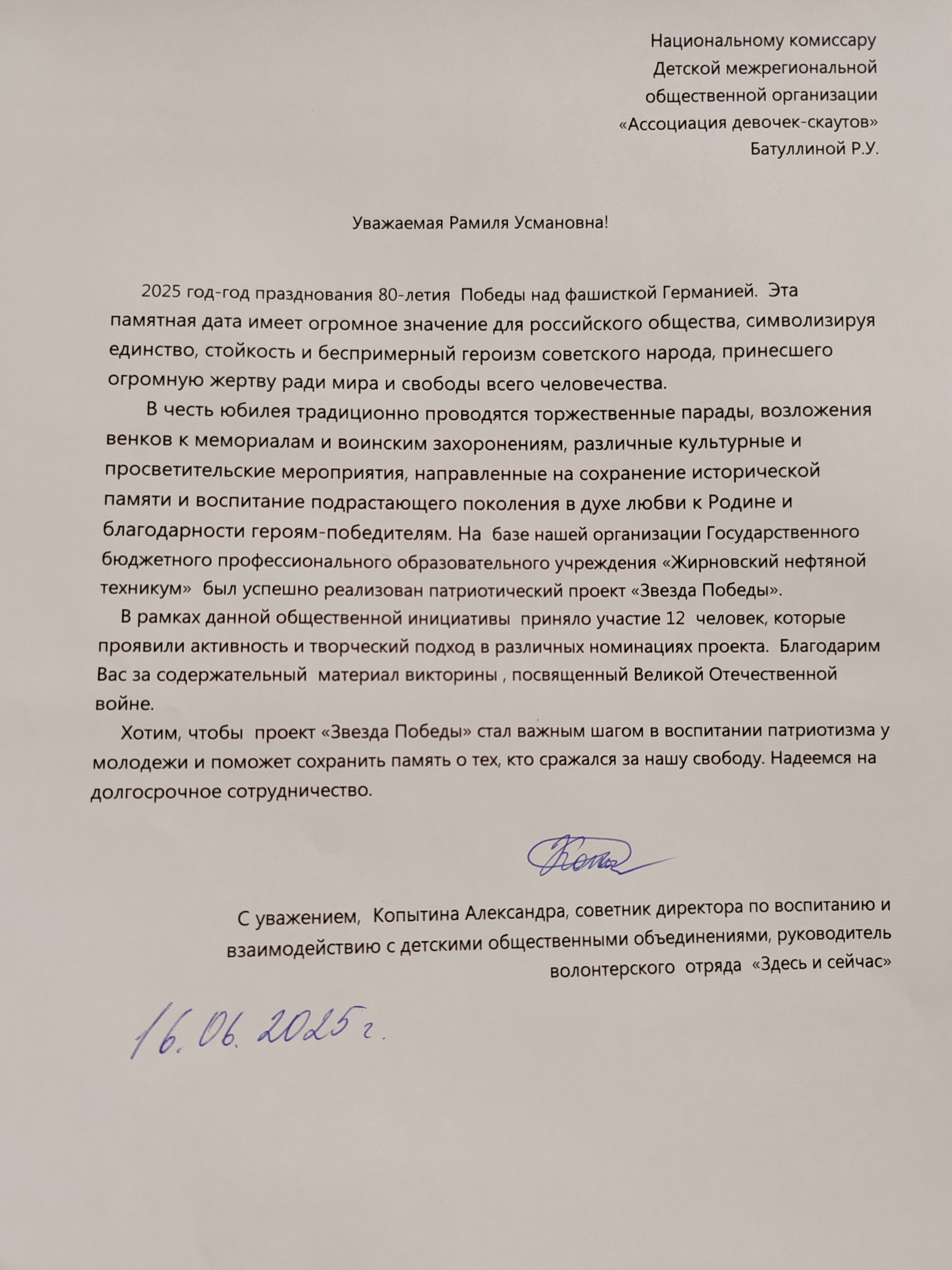 Проект «Звезда Победы» — это не просто инициатива, а важный шаг к воспитанию у подрастающего поколения чувства гордости за свою страну и её историю. В этом году мы отмечаем 80-летие Победы в Великой Отечественной войне, и именно в рамках этого проекта дети, подростки и студенты получают уникальную возможность почувствовать свою причастность к великому историческому событию, которое навсегда изменило судьбы миллионов людей.