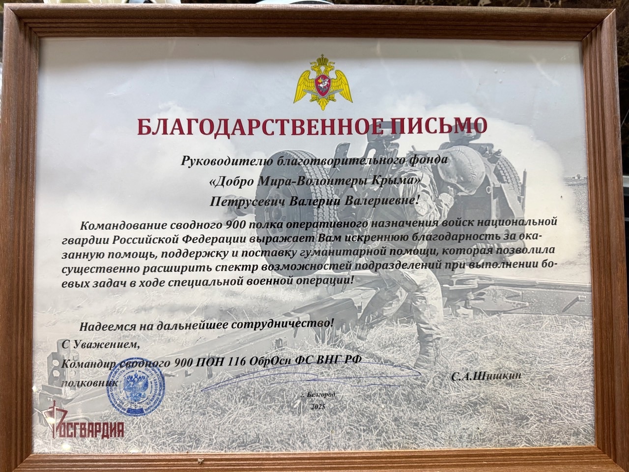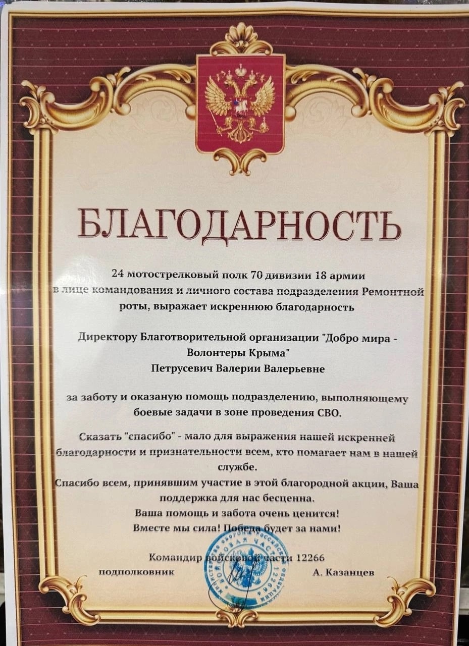 Важнейшим акцентом помощи является передача дорогостоящих технических средств для военных. Добро Мира- Волонтеры Крыма подарили фронту более 100 полноприводных автомобилей. Переданы многочисленные дроны, тепловизоры, средства связи и другое оборудование для участников специальной военной операции на сумму свыше 80 млн. руб., также передано более 50 тонн лекарств и расходников в госпитали и медбаты. Работа ведётся индивидуально с каждым подразделением, с отдельными солдатами и подразделениями в целом, что подтверждается многочисленными благодарственными письмами и наградами. Сотни тысяч людей продолжают получать помощь от нашего фонда.