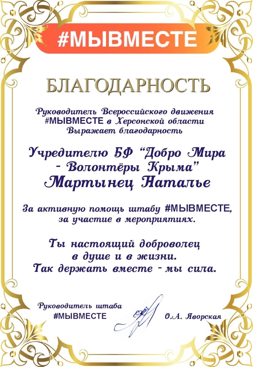 В настоящее время приоритетным направлением деятельности фонда "Добро Мира-Волонтёры Крыма" является оказание помощи военнослужащим и мобилизованным гражданам, а также их семьям. Волонтеры принимают и обрабатывают заявки от военнослужащих и мобилизованных граждан для выполнения адресной (бытовой) помощи, оказания психологических и юридических консультаций, организовывают досуговые мероприятия. Волонтеры изготавливают окопные свечи, готовят «сухие борщи», шьют анти тепловизионные покрывала, термобелье, плетут маскировочные сети и сооружают тактические носилки, а также с помощью 3D-принтеров создают специальные изделия для военнослужащих специальной военной операции. Добровольцами Благотворительного фонда «Добро Мира-Волонтеры Крыма» с 2022 года собрано свыше 700 тонн гуманитарной помощи для нуждающихся исторических регионов и военнослужащих специальной военной операции.