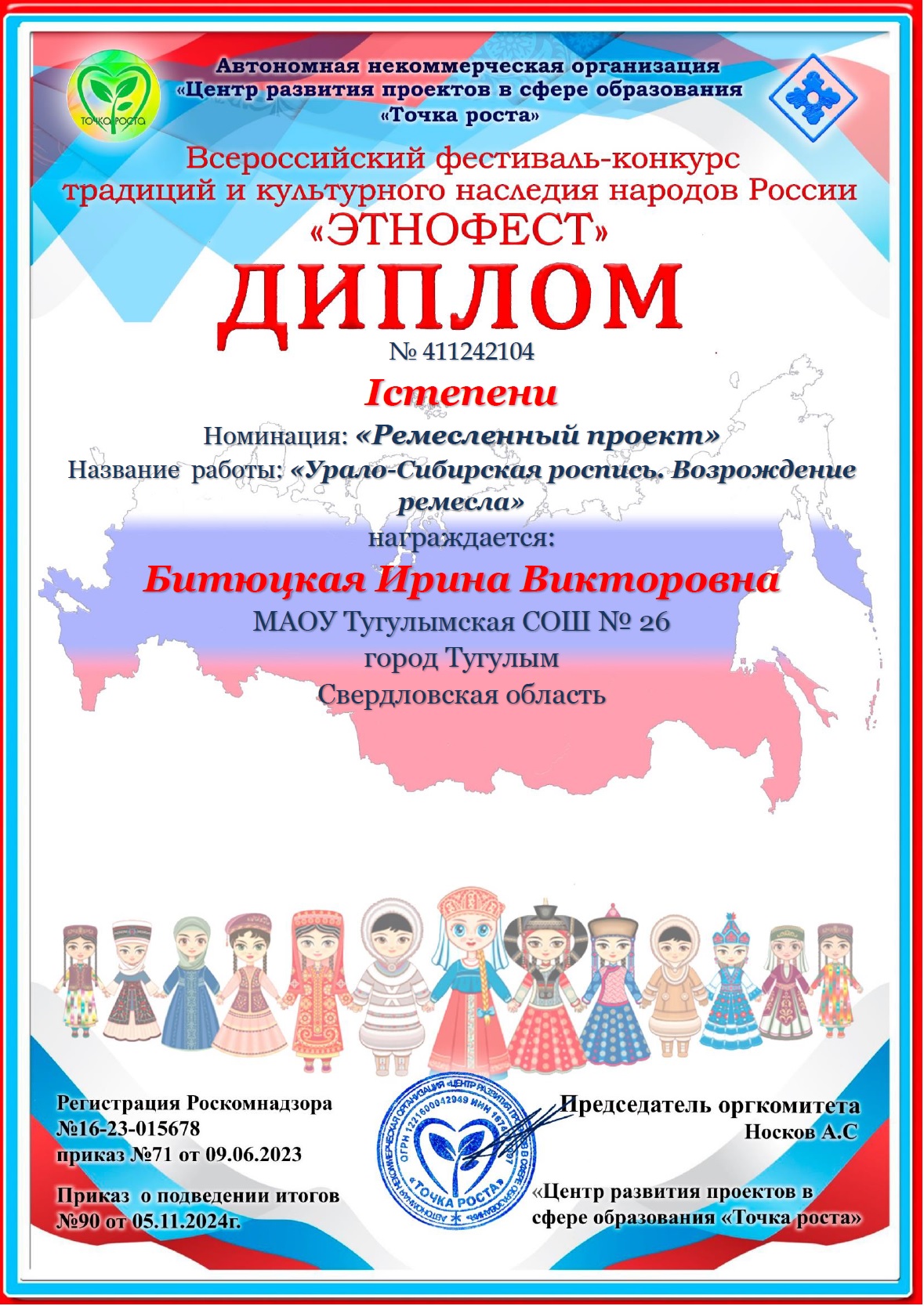 3. Участие во Всероссийском фестивале-конкурсе традиций и культурного наследия народов России «Этнофест» - Диплом I степени 05.11.2024г.