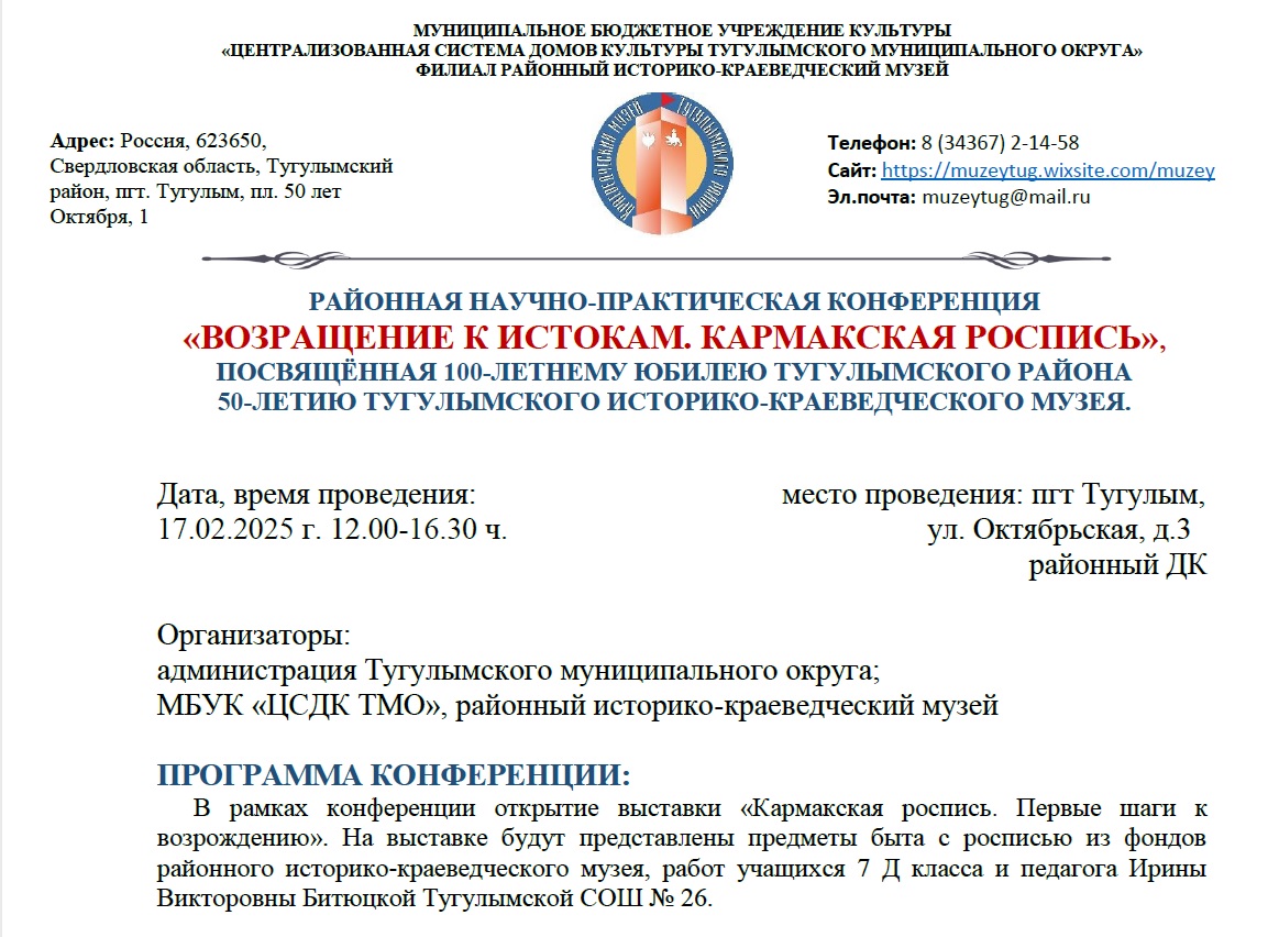13.Приняли участие в районной научно-практической конференции "Возвращение к истокам, Кармакская роспись", посвященная 100-летнему юбилею Тугулымского района, 50-летию Тугулымского историко-краеведческого музея.