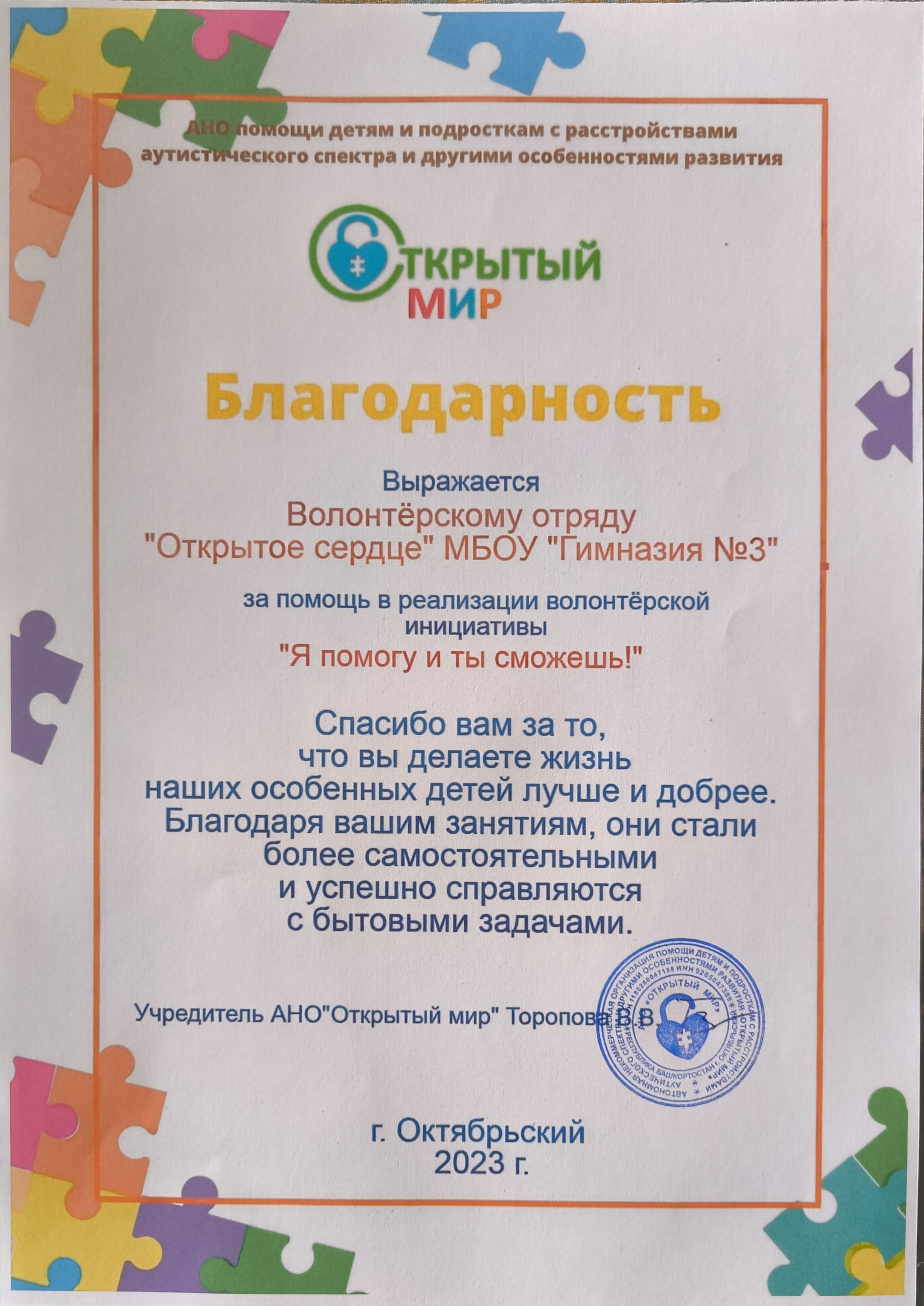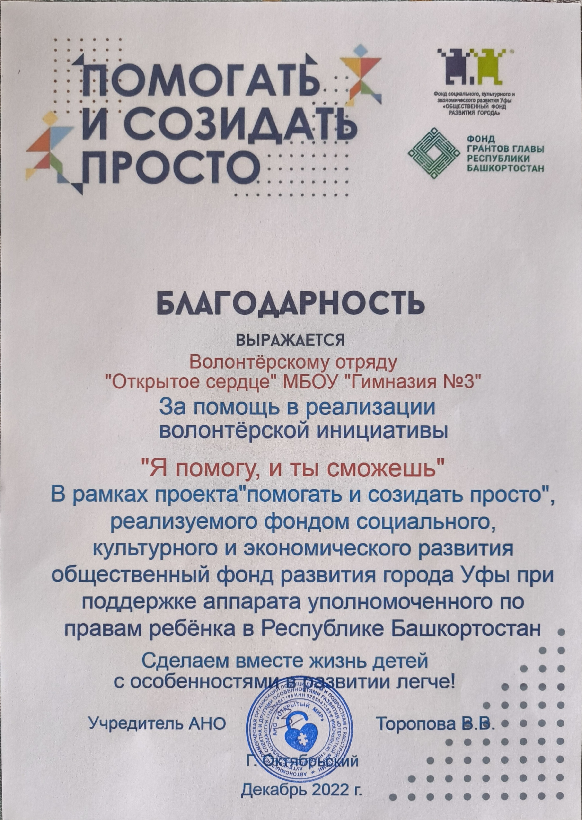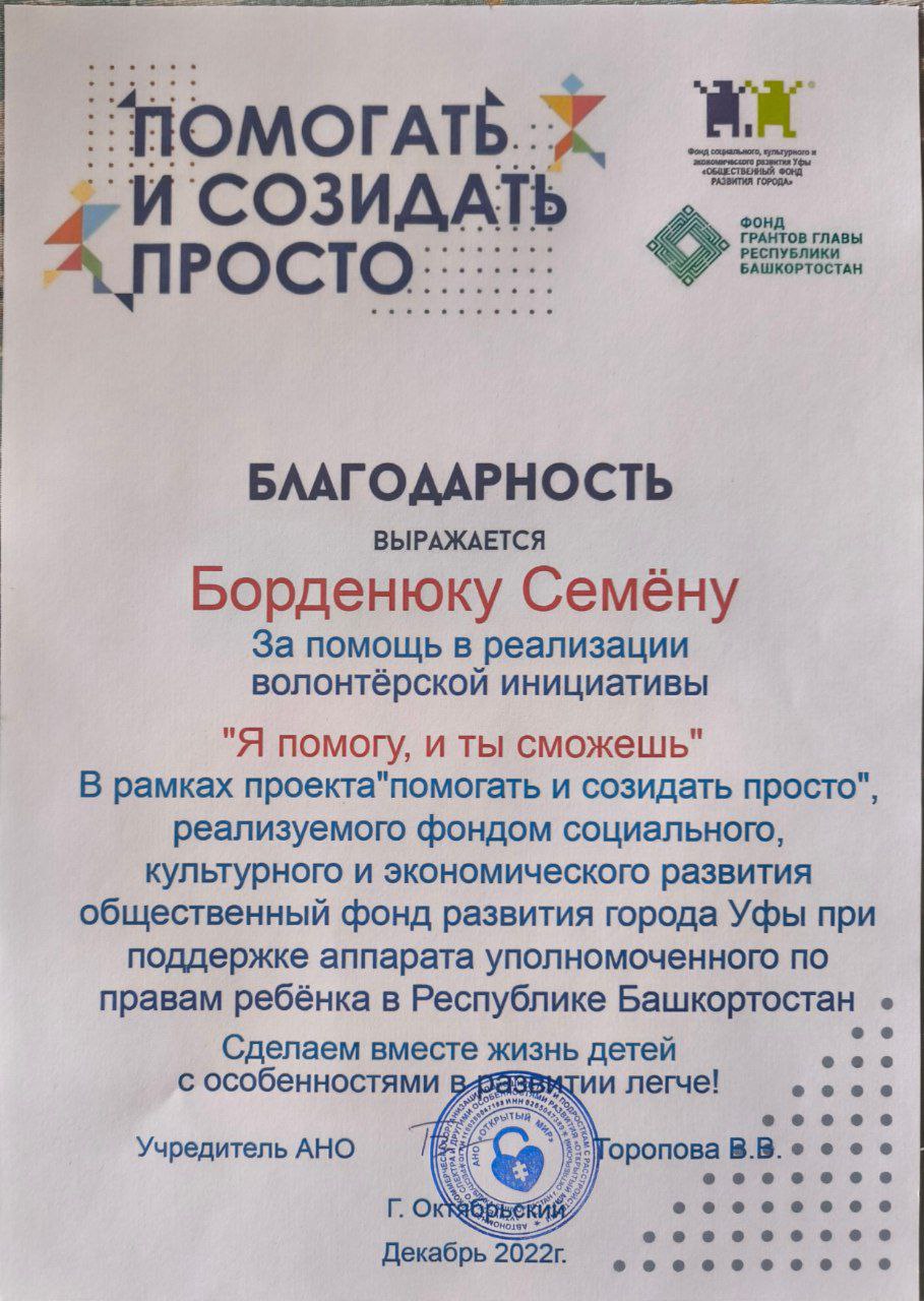 В октябре 2022 г. волонтерская инициатива "Я помогу, и ты сможешь" была поддержана фондом социального, культурного и экономического развития общественный фонд развития города Уфы при поддержке аппарата уполномоченного по правам ребенка в Республике Башкортостан, получила мини грант на закупку оборудования в размере 30 тыс. рублей и оказалась очень востребованной родителями детей с ОВЗ и инвалидностью. В течении 2,5 лет инициатива проводилась с разными детьми и подростками 3 раза.