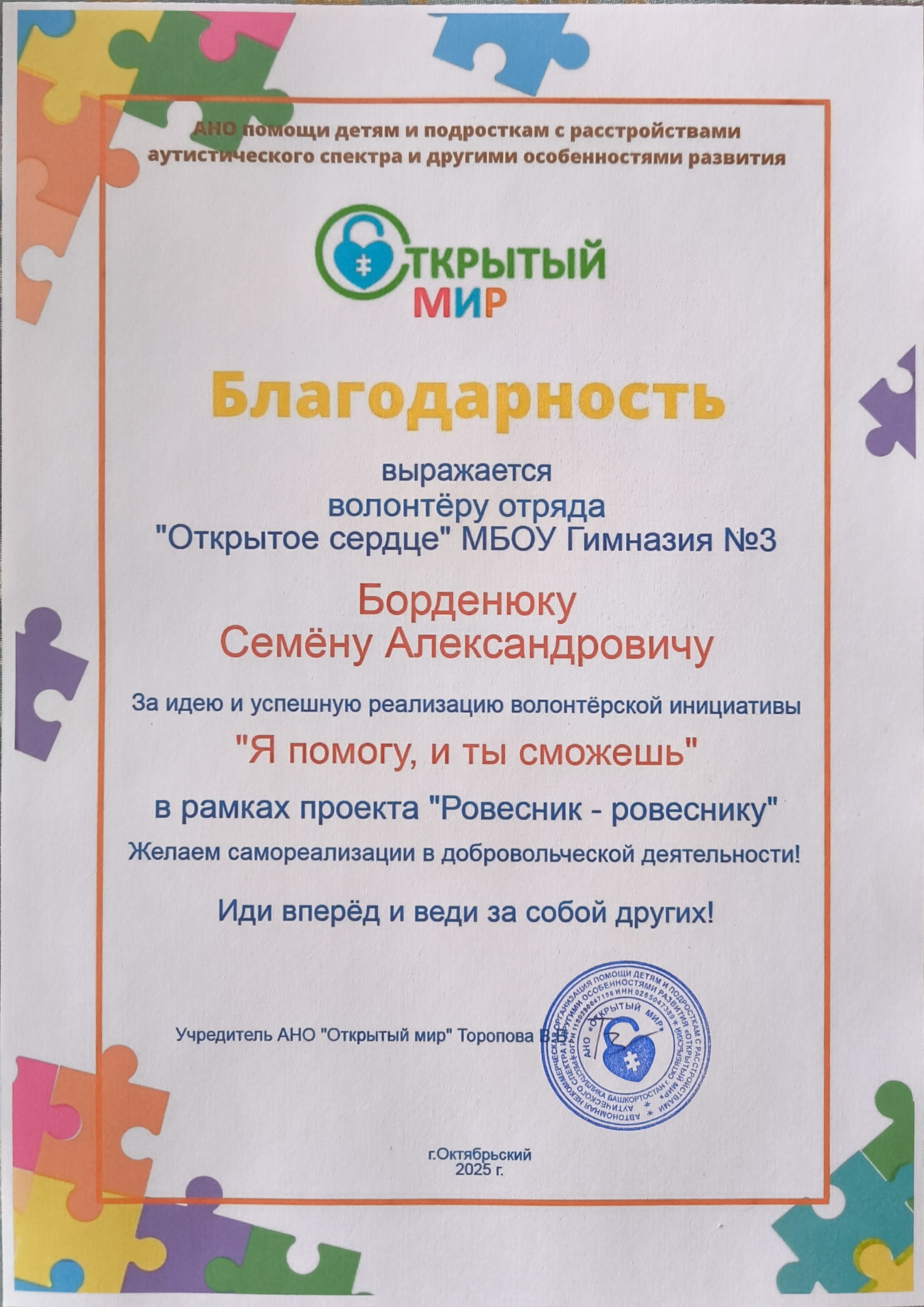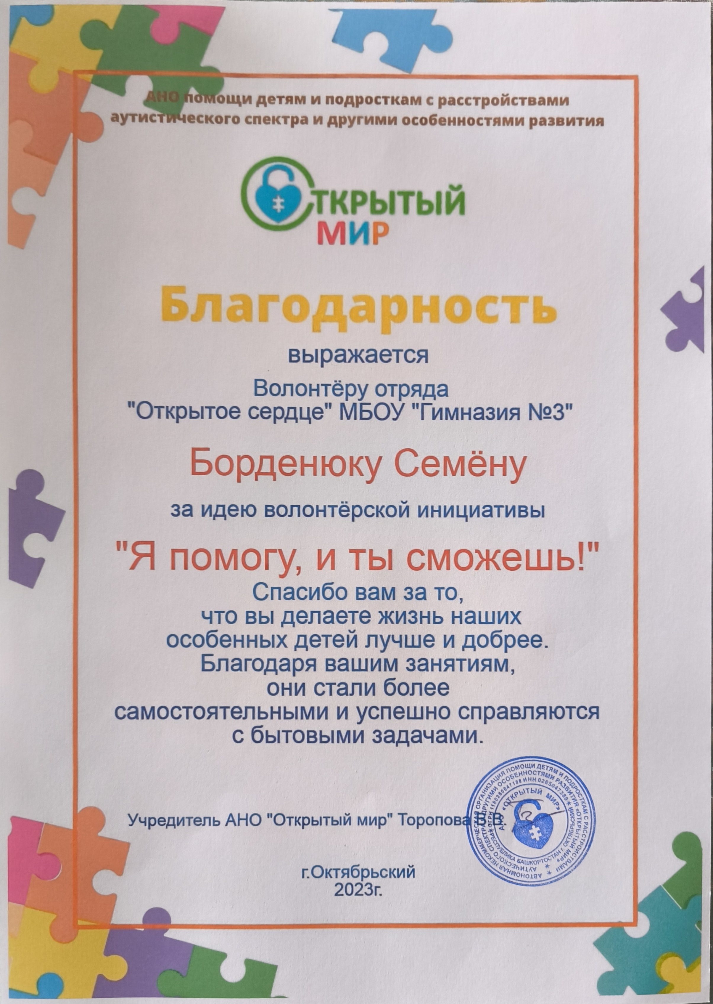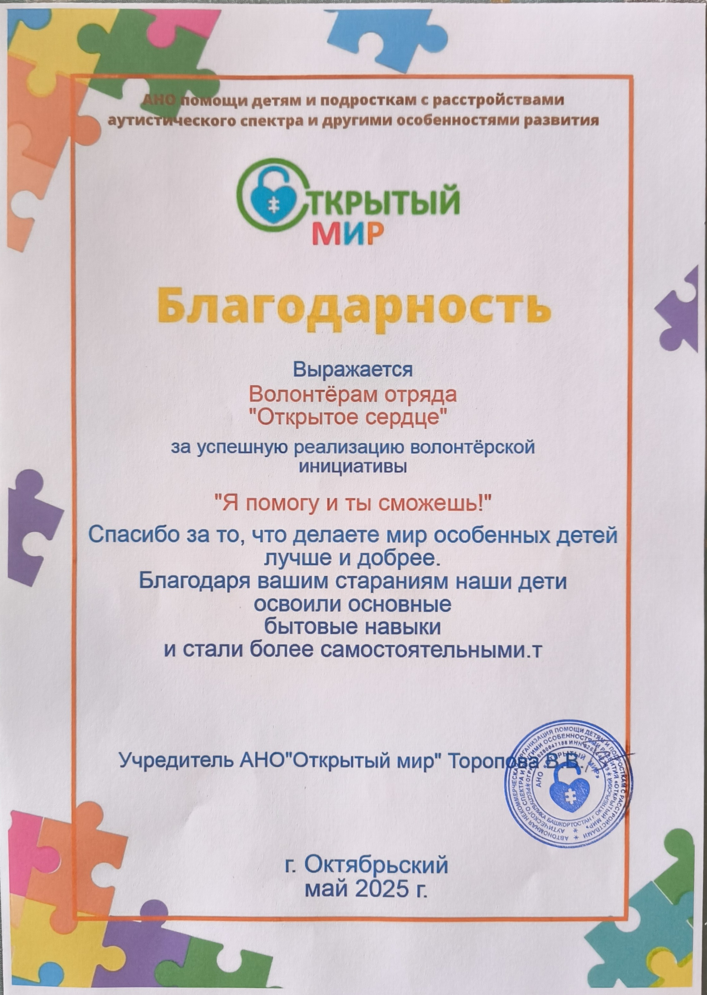 В октябре 2022 г. волонтерская инициатива "Я помогу, и ты сможешь" была поддержана фондом социального, культурного и экономического развития общественный фонд развития города Уфы при поддержке аппарата уполномоченного по правам ребенка в Республике Башкортостан, получила мини грант на закупку оборудования в размере 30 тыс. рублей и оказалась очень востребованной родителями детей с ОВЗ и инвалидностью. В течении 2,5 лет инициатива проводилась с разными детьми и подростками 3 раза.