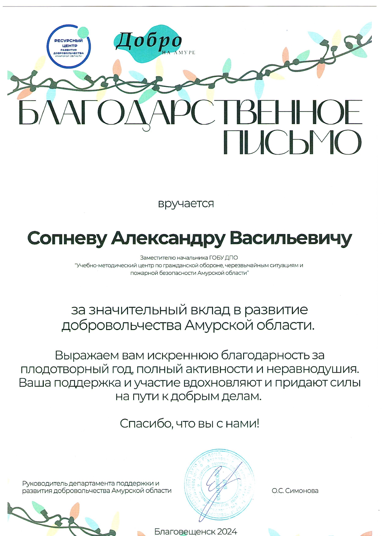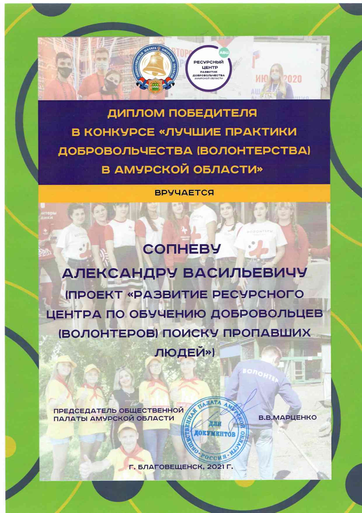 Ресурсный центр становился лауреатом премии Губернатора Амурской области за большой вклад в развитие поискового добровольчества в Амурской области в 2020 и 2023 г.г., победителем конкурса «Лучшие практики добровольчества (волонтерства) в Амурской области» 2021 г., победителем конкурса социально значимых поступков жителей Амурской области «Поступки и люди» в 2021 году в номинации «Гражданская позиция», финалистом Общественной премии «Неравнодушный гражданин» в Амурской области в номинации «Просвещение», победителем регионального этапа Международной Премии #МЫВМЕСТЕ в номинации «Помощь людям» 2022 г., полуфиналистом Всероссийских конкурсов волонтерских инициатив «ДОБРОВОЛЕЦ РОССИИ - 2019», «ДОБРОВОЛЕЦ РОССИИ - 2020», Международной Премии #МЫВМЕСТЕ в 2022 г., 2023 г., участником IV (2023 г.) и V (2025 г.) Всероссийского форума поисковиков, участником Международного форума добровольцев с торжественной церемонией вручения премии «Доброволец России» 2019 г., Международного форума гражданского участия #МЫВМЕСТЕ – 2023 г. и 2024 г.