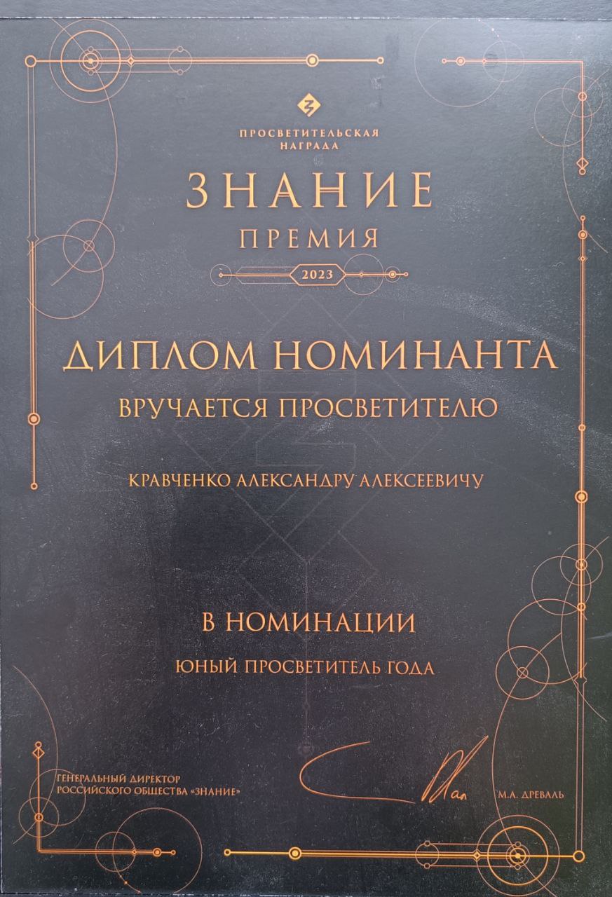 Создатель и ведущий проекта Александр Кравченко Номинант "Премии Знание" в номинации "Юный просветитель"