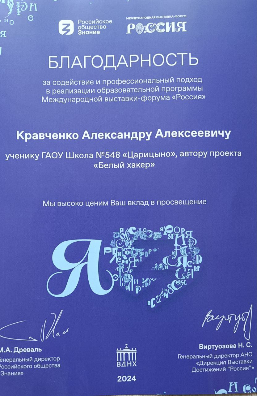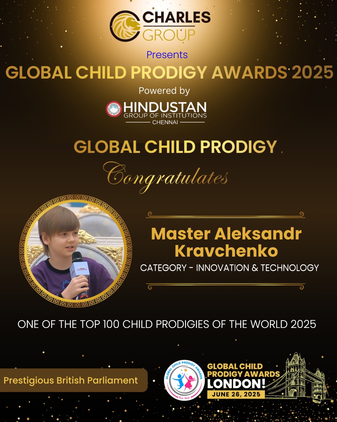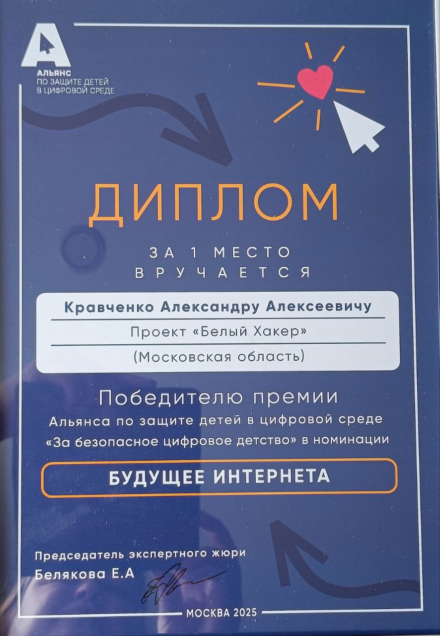 Лауреат Top 100 Child Prodigies – 2025, Global Child Prodigy Awards (Индия) (в том числе и за деятельность в рамках проекта "Белый Хакер")