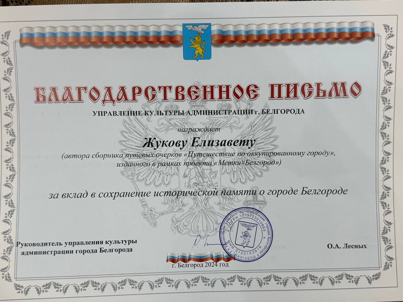 Патриотическое воспитание и сохранение исторической памяти о событиях, связанных с оккупацией города Белгорода, посредством выпуска к 1 декабря 2024 года сборника путевых очерков «Путешествие по оккупированному городу» в количестве 114 экземпляров по 6 объектам памяти и предоставлении пользователям возможности познакомиться с историческими фактами через визуальное и звуковое воссоздание событий с помощью специальных меток.