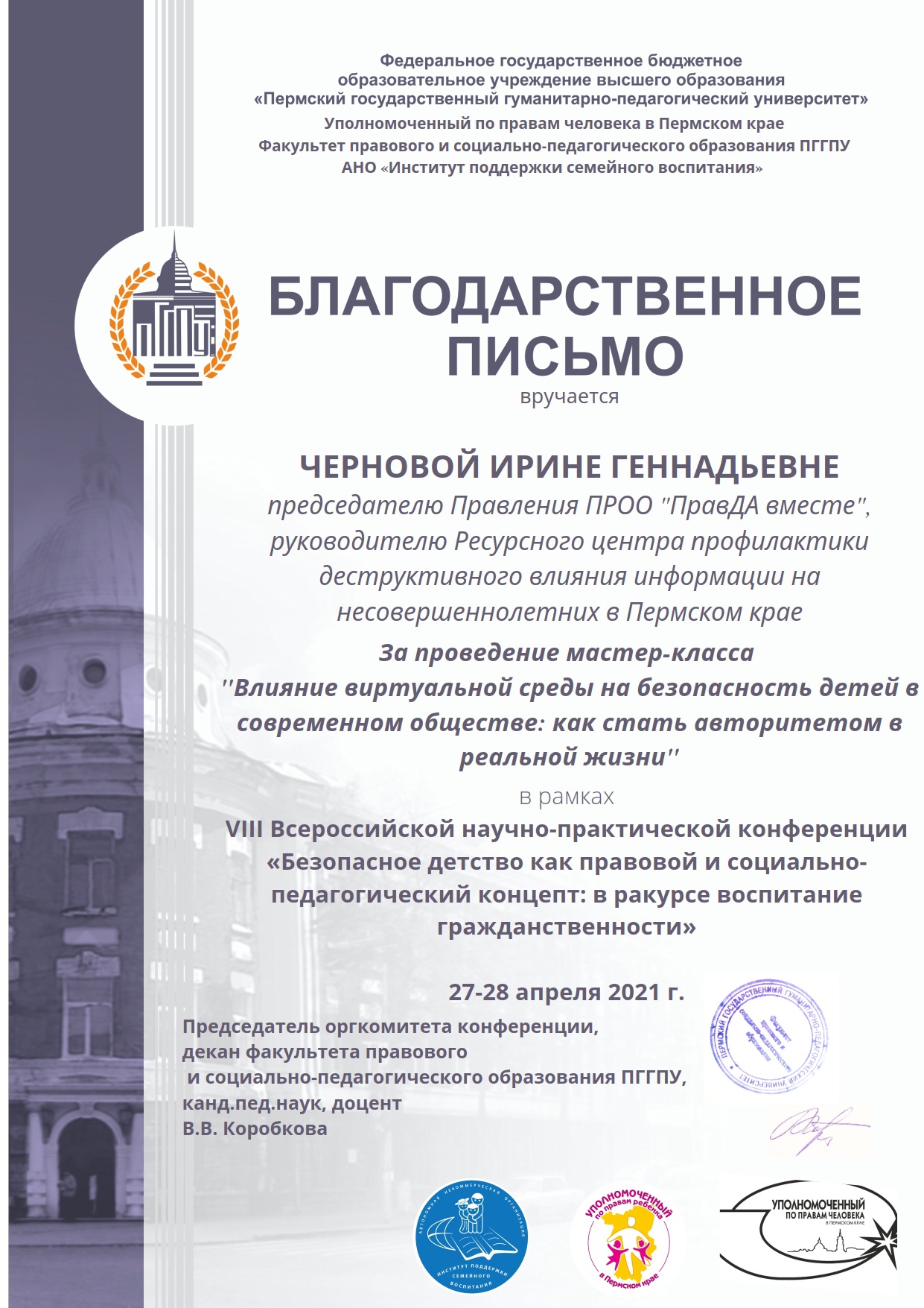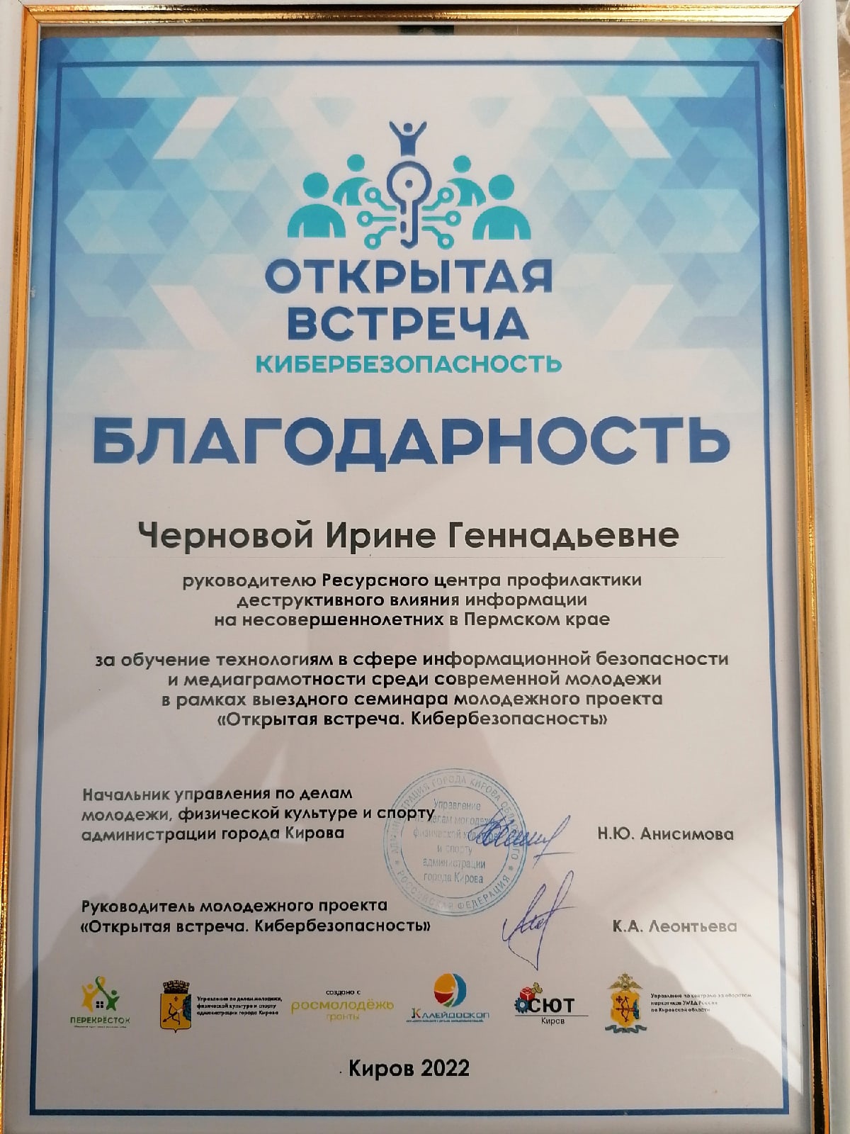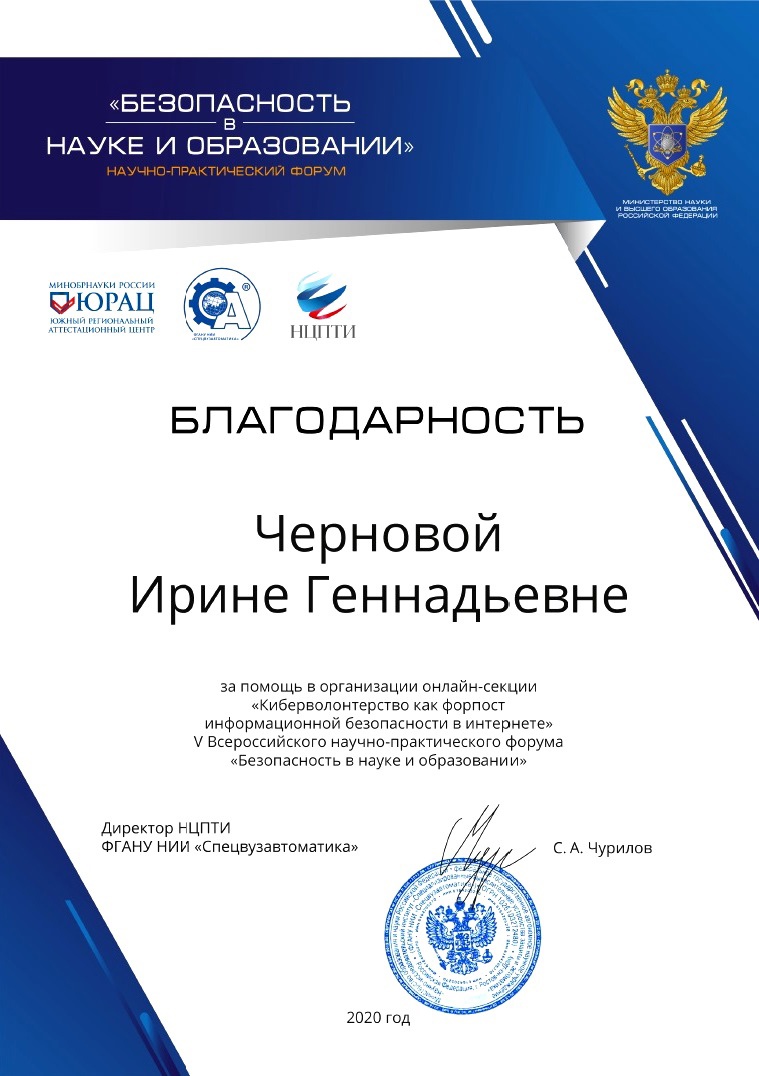 Создана КИБЕРдружина Пермского края, в состав которой вошли 150 экспертов-волонтеров; проведено более 1000 мероприятий для более 30 000 детей и взрослых, проживающих в Пермском крае; созданы авторские брошюры для детей (рабочая КИБЕРтетрадь, более 7000 экз.) и взрослых (брошюры «Дети и сети» и «Дети и сети 2.0», более 2000 экз.) по медиаграммотности и КИБЕРбезопасности; ежегодно более 400 сообщений о выявленном негативном контенте в сети направляется в уполномоченные органы (МВД, ФСБ, РКН, РПН и другие); работает единое окно консультаций (в социальной сети «Вконтакте») по вопросам безопасности в сети «Интернет», в которое ежегодно обращаются более 80 человек; ежегодно проводится более 5000 исследований зараженности цифровых профилей несовершеннолетних жителей края деструктивными культурами по запросам субъектов профилактики правонарушений.