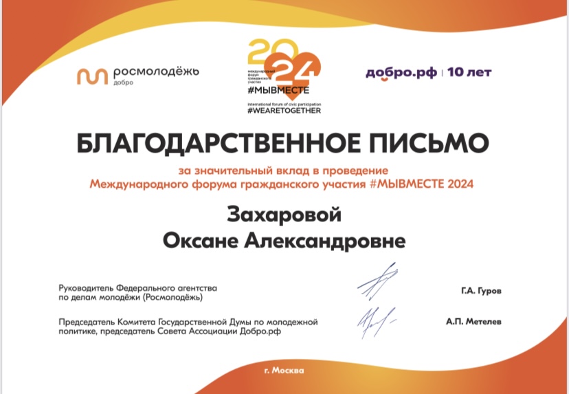 * Признание заслуг: Проект является участником Всероссийской премии «Служение» (с благодарностью Захаровой О.А.) и Всероссийского конкурса «Регион добрых дел», что подтверждает его высокую социальную значимость.