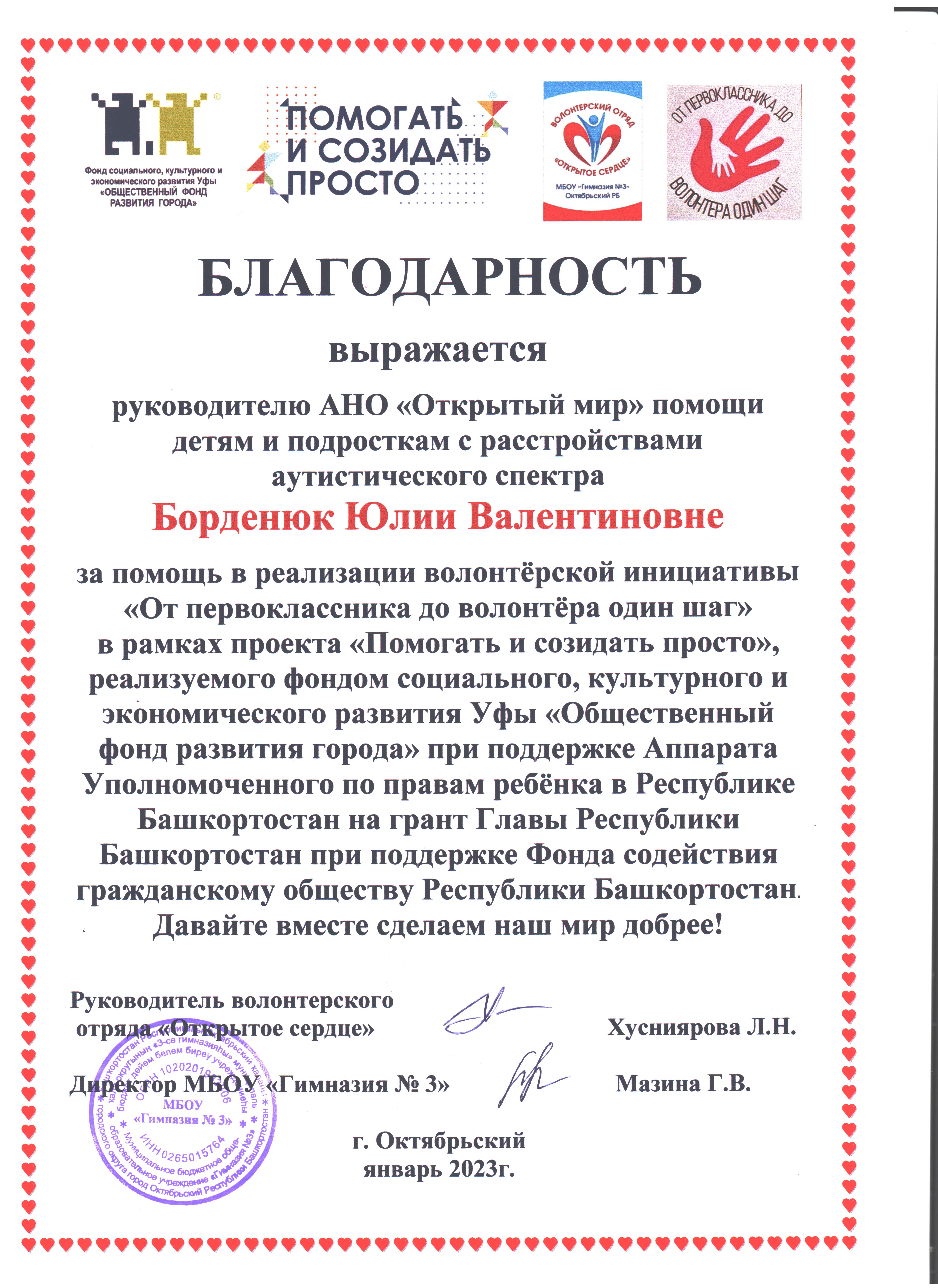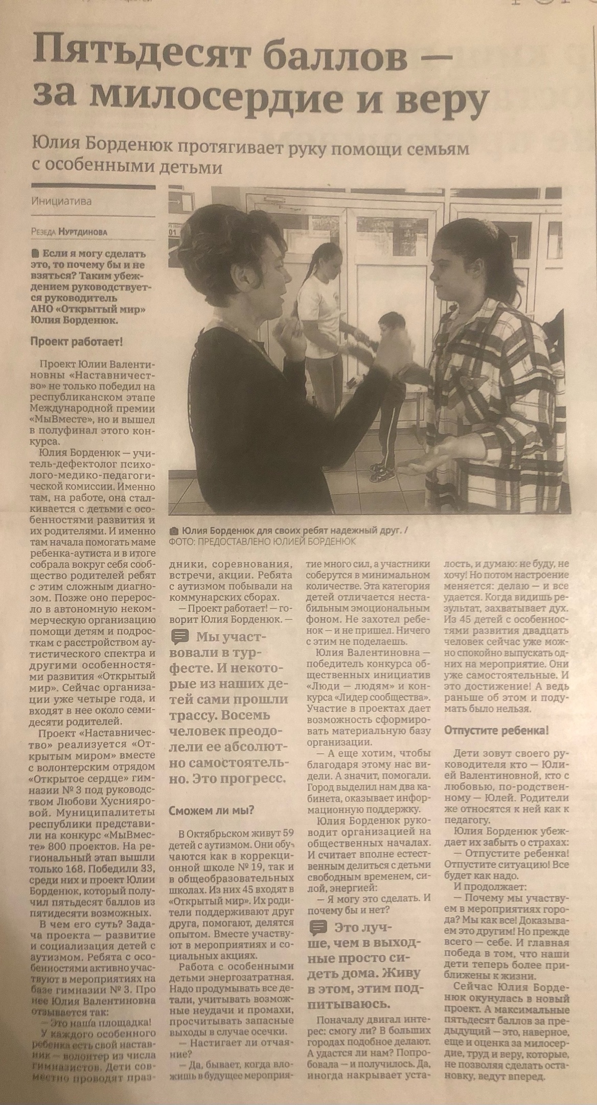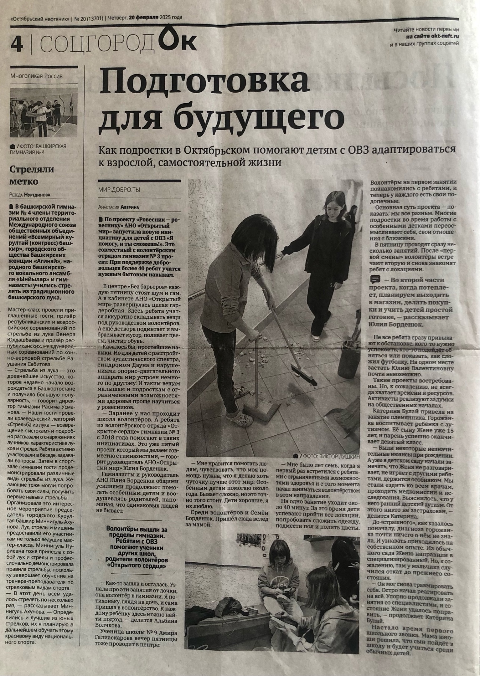В 2018 году в городе Октябрьский Республики Башкортостан начали проводиться совместные мероприятия АНО помощи детям и подросткам с расстройствами аутистического спектра и другими особенностями развития "Открытый мир" с волонтерским отрядом «Открытое сердце» МБОУ «Гимназия № 3». В сентябре 2022 году появился проект «Ровесник-ровеснику», который представляет собой эффективную модель организации наставнической деятельности, позволяющий волонтерам-школьникам оказывать поддержку и содействие детям и подросткам с ограниченными возможностями здоровья и инвалидностью в различных сферах жизни.