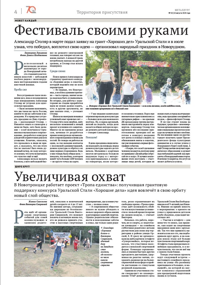 02.11.2025 «На разминку приглашаем и больших, и малышей!» 40 участников, 7 волонтёров. https://vk.com/wall-231725274_76; https://vk.com/wall-222525884_15695; Публикации ВК УС https://vk.com/wall-195252038_30384; ДоброМедиа https://dobro.press/dobro-media/blogi/1311670; Публикация Хорошие Дела https://vk.com/wall-220659194_760