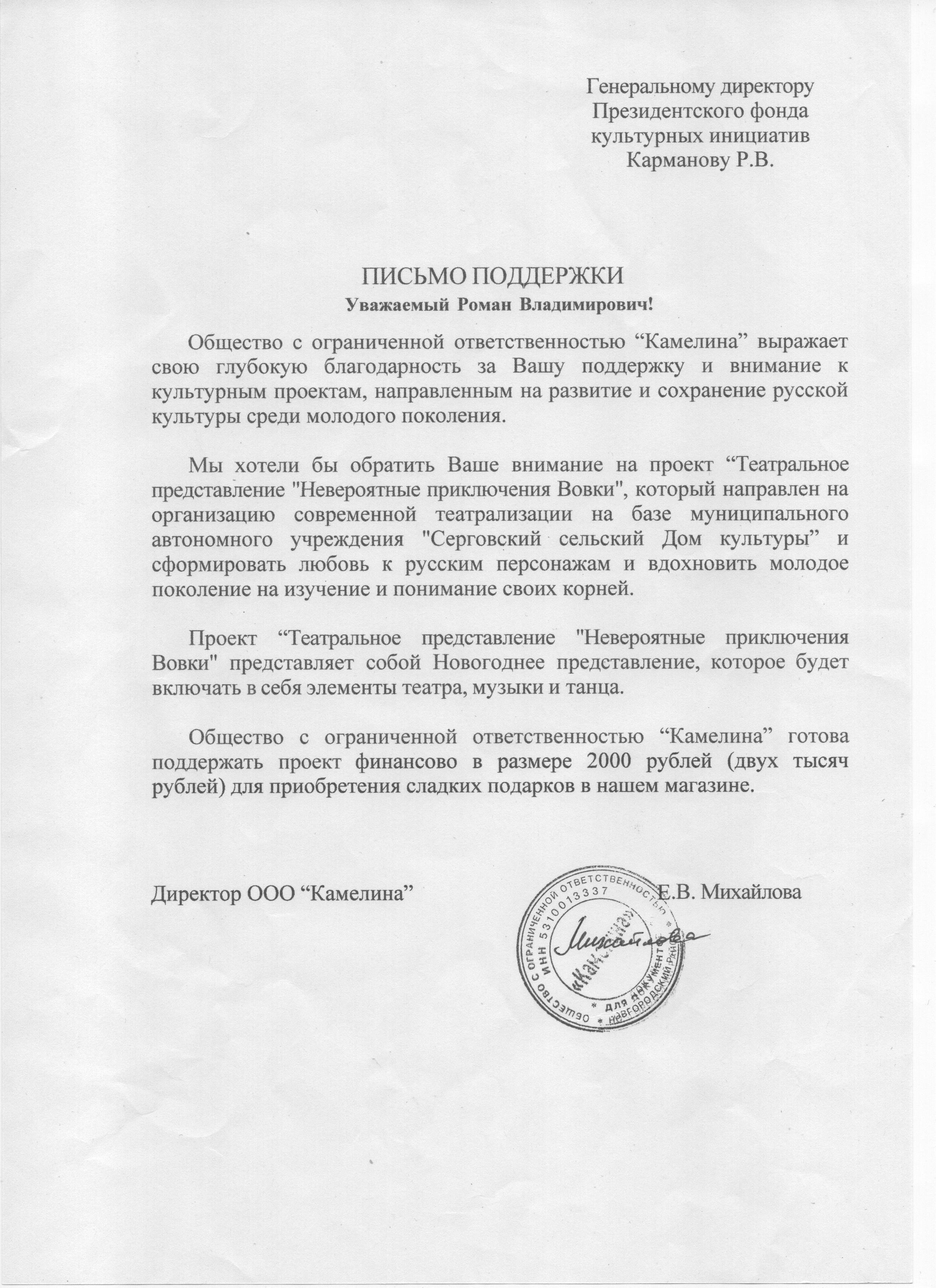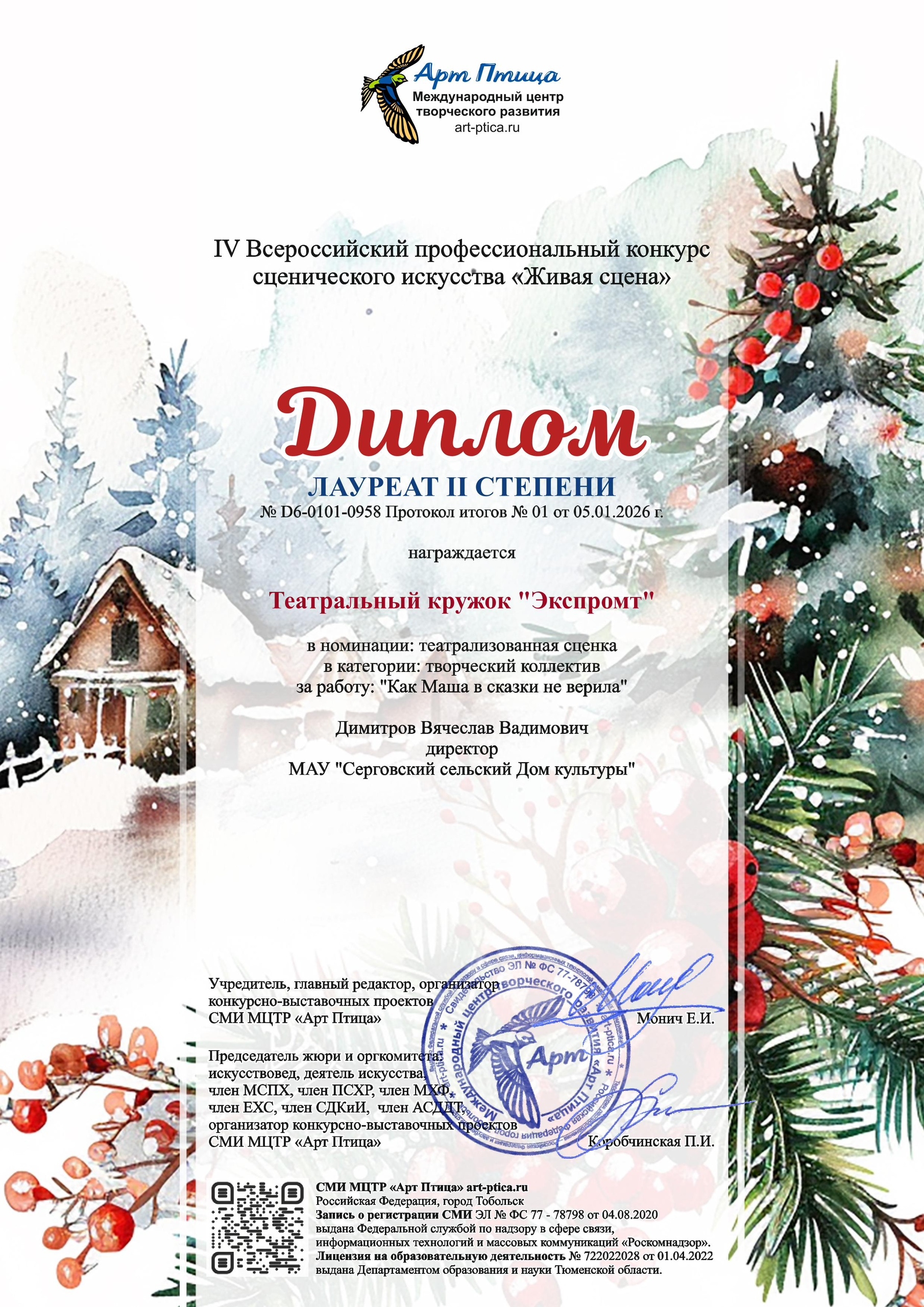 В рамках этого проекта организовано одно новогоднее театрализованное представление, основанное на русских народных сказках, но с добавлением современных технических элементов в речь и образ актеров. Местом проведения была выбрана небольшая сцена Серговского сельского Дома культуры, где детская аудитория особенно восприимчива к подобным постановкам.