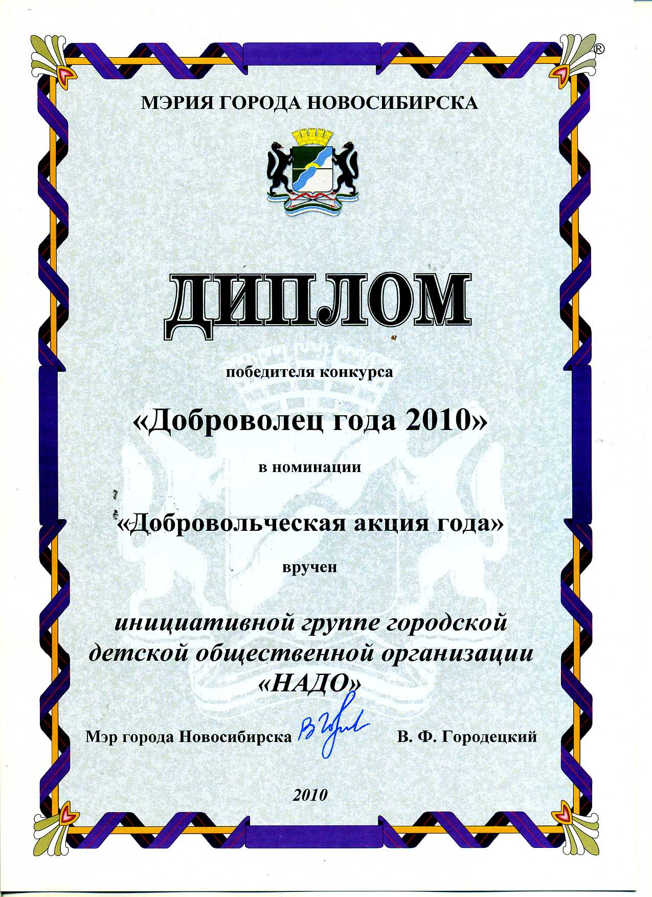 С 1991 года НАДО активно занимается развитием добровольческой деятельности и внедряет в свою деятельность традиции с участием добровольцев. В течение восьми лет на площади имени Ленина в рамках общегородской добровольческой акции по сдаче донорской крови «Помоги делом!» была организована работа мобильного пункта сдачи крови для популяризации донорства среди населения как показателя здорового образа жизни. С 16 июня по 04 июля 2013 года на базе НАДО был создан штаб, который организовывал работу более 400 добровольцев, принимавших участие в проведении Международных детских игр «Спорт – Искусство – Интеллект», проходивших в Новосибирске. В рамках реализации проекта «Мы – за чистый город!» ежегодно проводятся мероприятия, направленные на консолидирование деятельности детских и молодежных экологических объединений, организаций в деле охраны окружающей среды. На долгосрочной основе в ассоциации ежегодно работают около 45 добровольцев (около 20 человек входят в состав Совета старейшин, а молодые добровольцы в возрасте до 18 лет входят в состав детского парламента «НАДОвская Дума» (20 - 25 человек). Для реализации всех проектов в НАДО создаются инициативные группы из числа волонтёров, которые берут на себя полную ответственность за проведение мероприятий. В течение 2018 года НАДО привлекла для работы 112 волонтёров, которые входили в состав инициативных групп. К долгосрочным результатам проекта можно отнести изменение отношения общества к добровольческому труду в положительную сторону; привлечение большего количества молодых людей к добровольческой деятельности; создание детских и молодёжных добровольческих отрядов на территории города Новосибирска. Объединения, которые входят в состав НАДО, создают совместные проекты. НАДО - это детская организация, в которой юные танцоры, ораторы, художники, экологи, спортсмены, певцы, артисты и интеллектуалы чувствуют причастность к жизни Новосибирска, стараются сделать наш город красивым, чистым, гостеприимным и социально-активным.