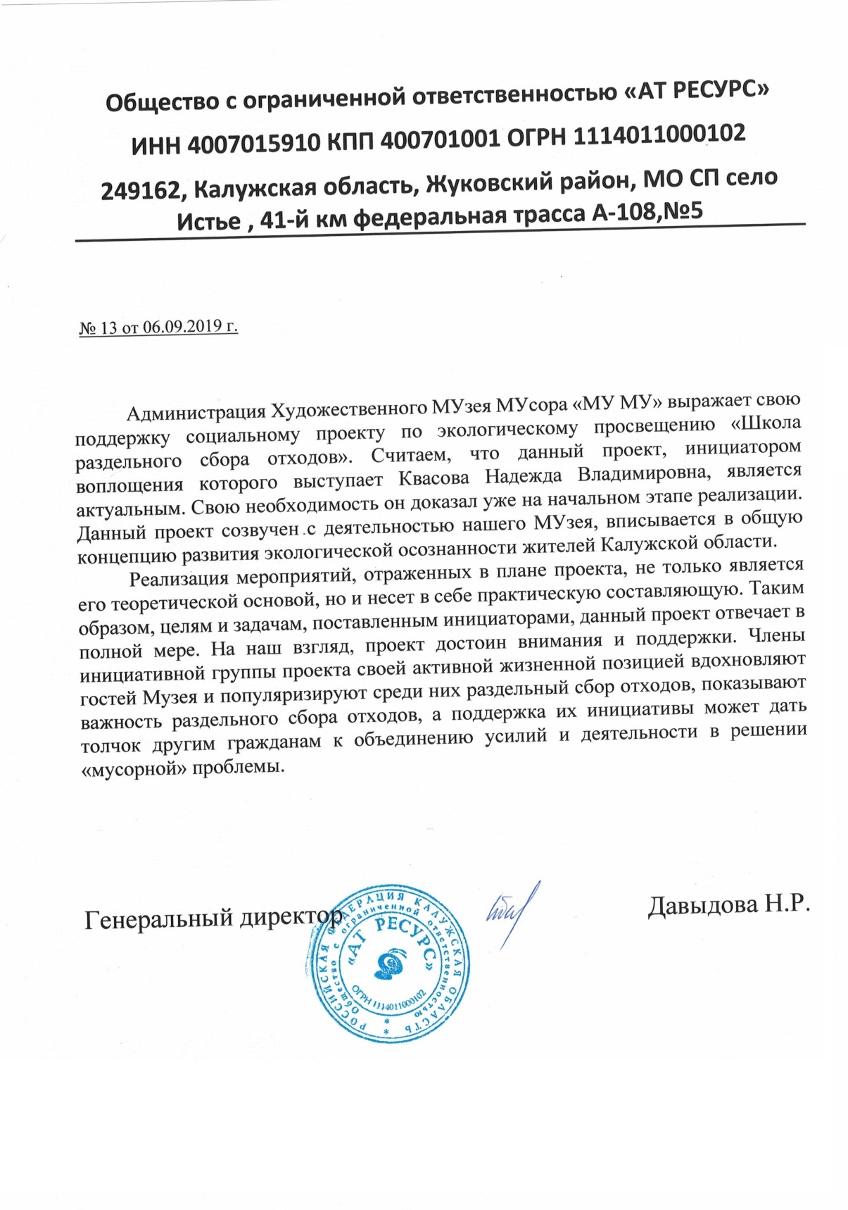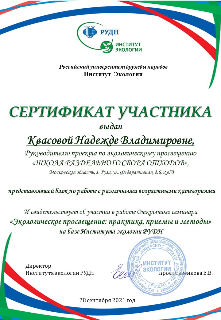 За 2018-2022 гг. проведено порядка 90 мастер-классов по раздельному сбору отходов и около 50 занятий по экопросвещению более, чем на 30 площадках Московской области (в том числе в детских садах, школах, учреждении для детей-сирот, реабилитационном центре, воспитательной колонии для несовершеннолетних) и общественных площадках Калужской области. Просветительской работой охвачено более 1500 человек. Благодаря деятельности нашего проекта существенно увеличилось число разделенных отходов на территории, обслуживаемой Рузским региональным оператором (с 18 тонн отсортированных отходов в сентябре 2018 года до 150 тонн на сентябрь 2021 года).