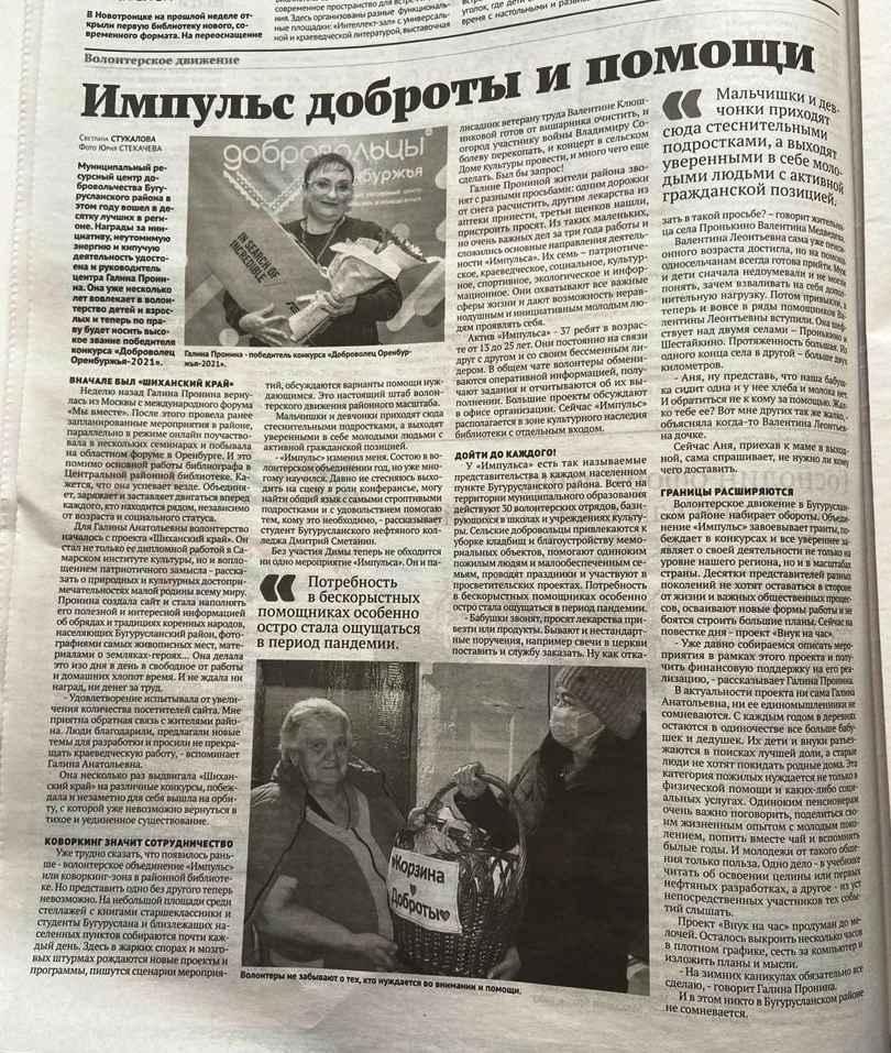В проекте "Шиханский край" (Бугурусланский район) на данный момент принимает участие более 100 человек, из которых 40 % волонтёры культуры.
