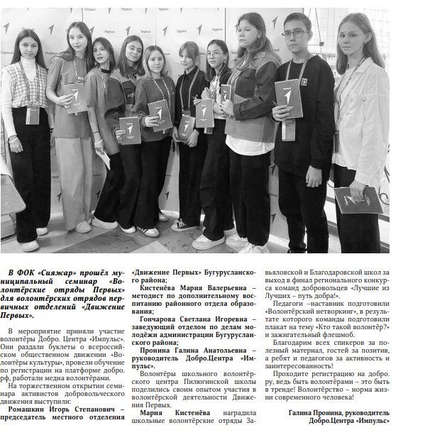 Собирается информация об участниках Великой Отечественной войны, а также проводятся уроки мужества с ветеранами боевых действий локальных войн и ветеранами, которые проходили службу за пределами Отечества. Готовится историко-краеведческий маршрут "#ПамятьПобеды. Памятники воинской Славы Бугурусланского района".