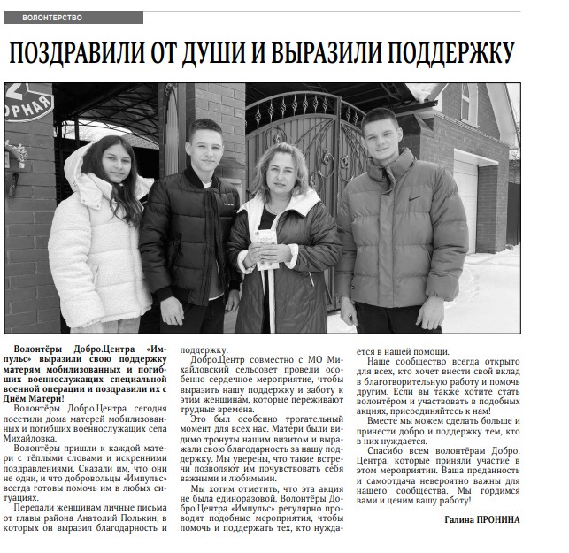 Создано волонтёрское объединение "Импульс" в состав которого входит на данный момент 42 человека. В 2023 году был подписан лицензионный договор социальной франшизы, и мы получили статус "Добро.Центр".