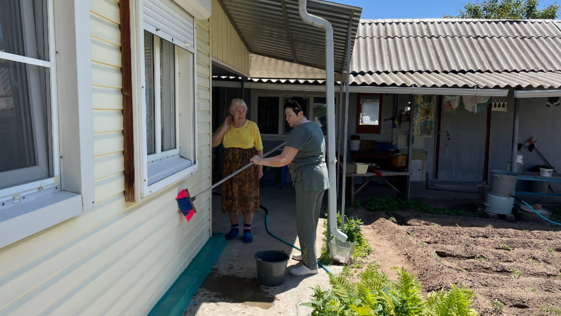 "Зашла к своей соседке Валентине Яковлевне проведать .. Она посетовала, что надо помыть панели, чем оббит дом, а то пыль набилась.